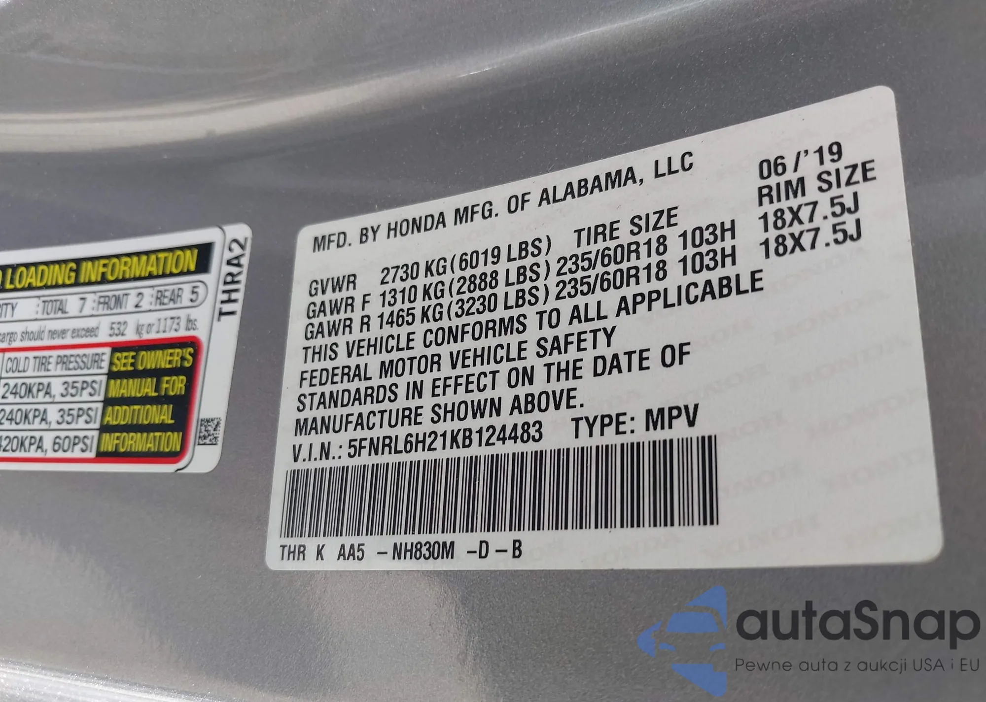• VIN 5FNRL6H21KB124483