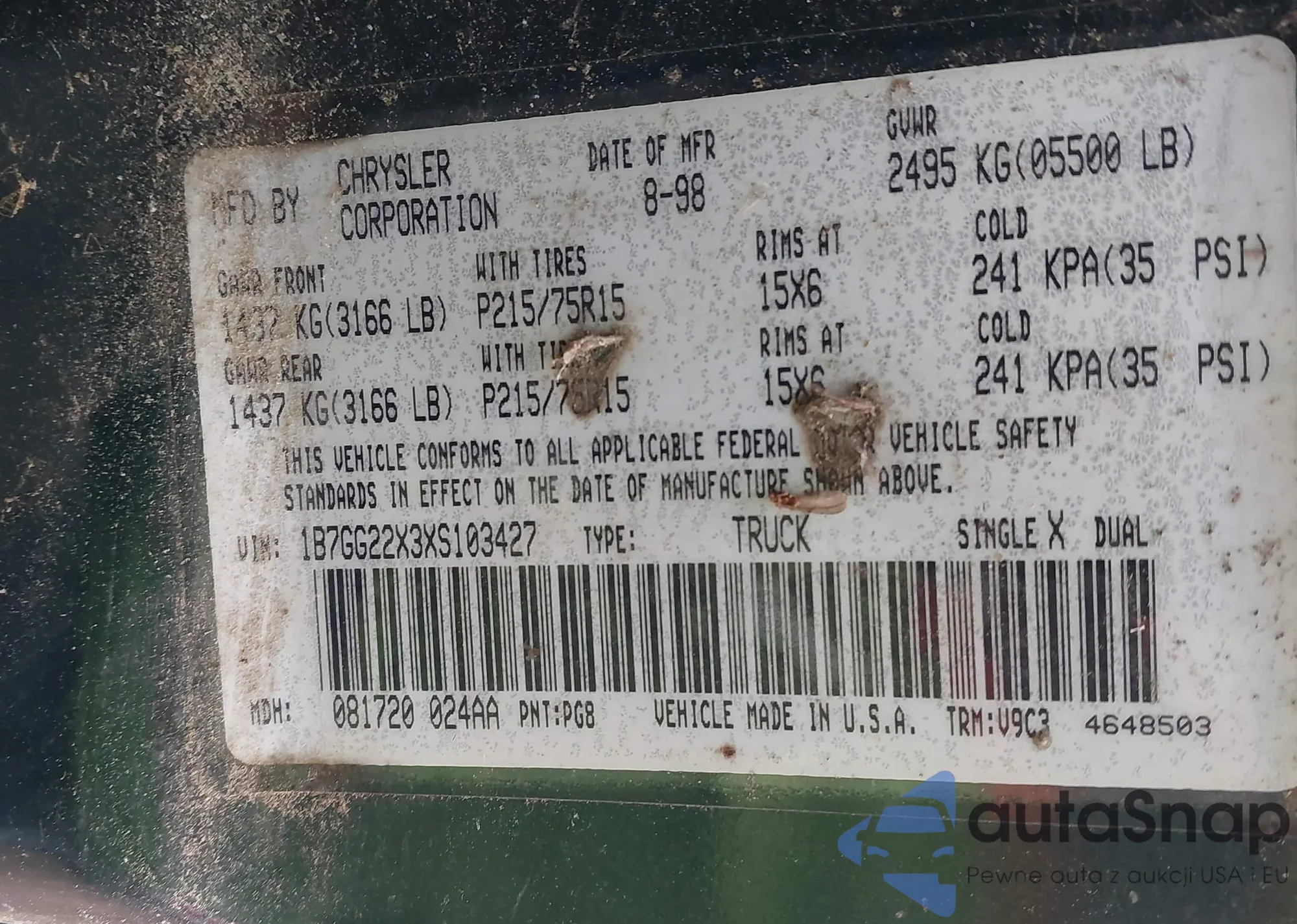 • VIN 1B7GG22X3XS103427