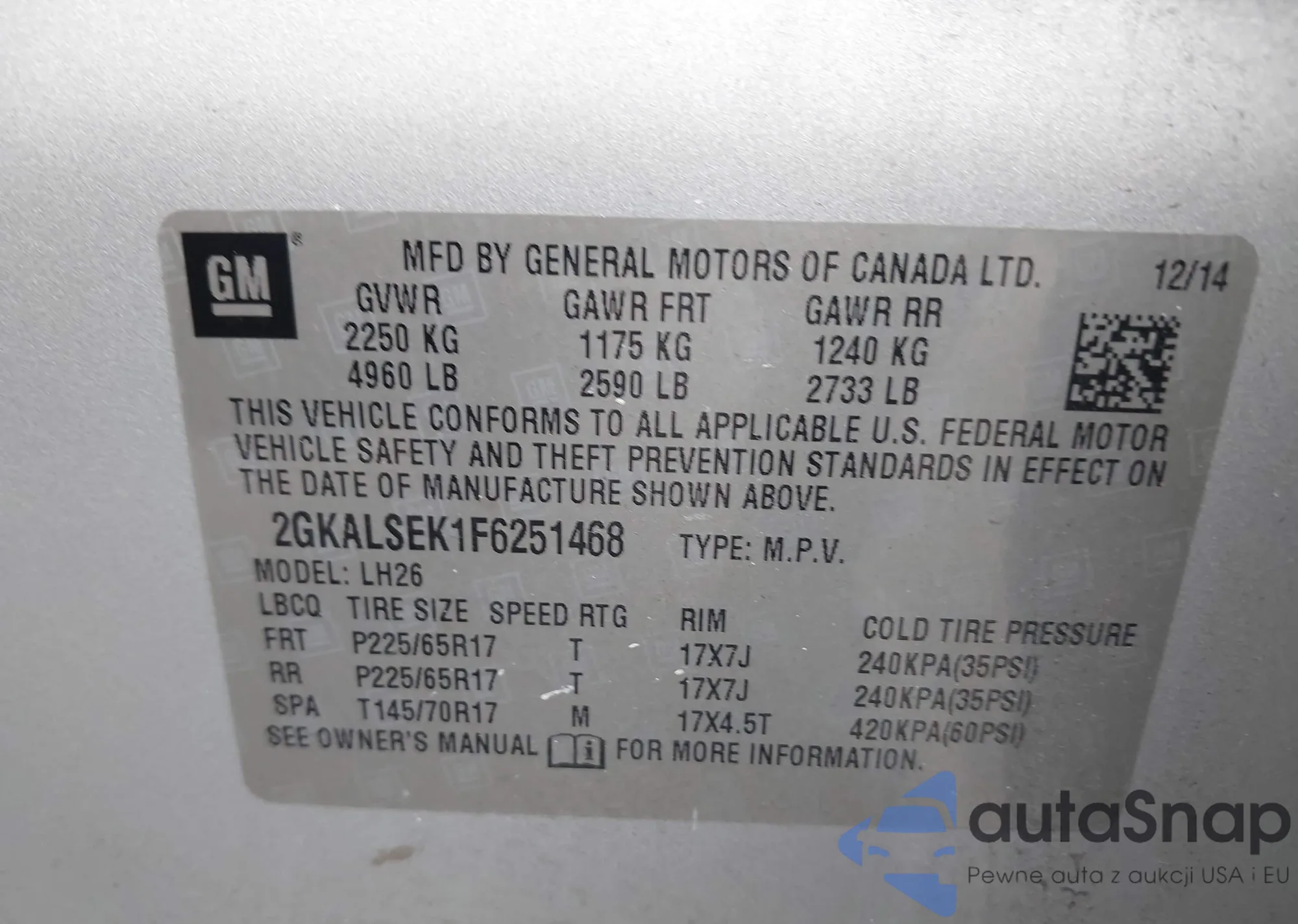 • VIN 2GKALSEK1F6251468