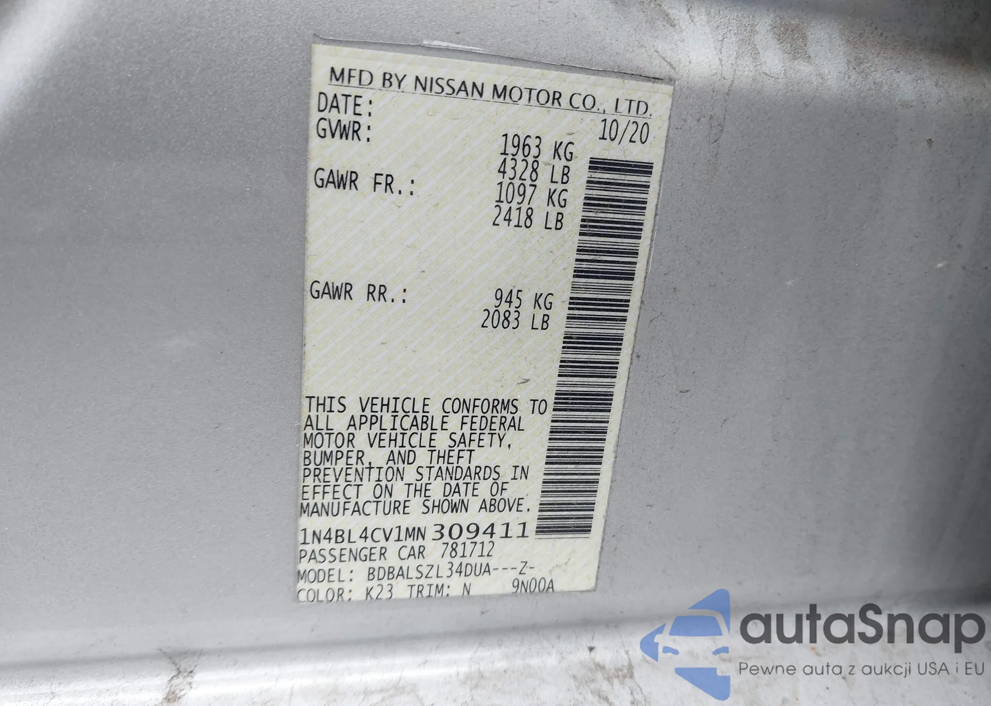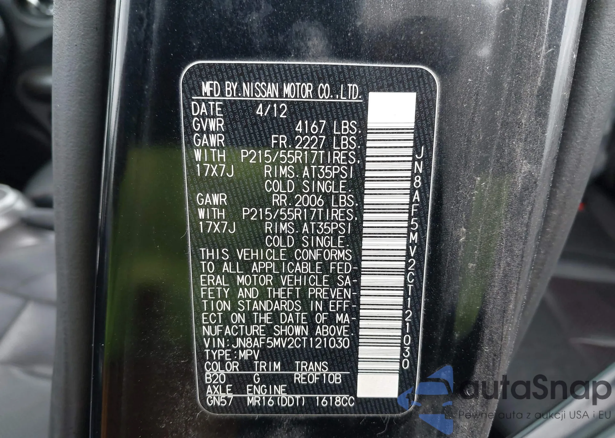 LOT: 43308031 VIN: JN8AF5MV2CT121030