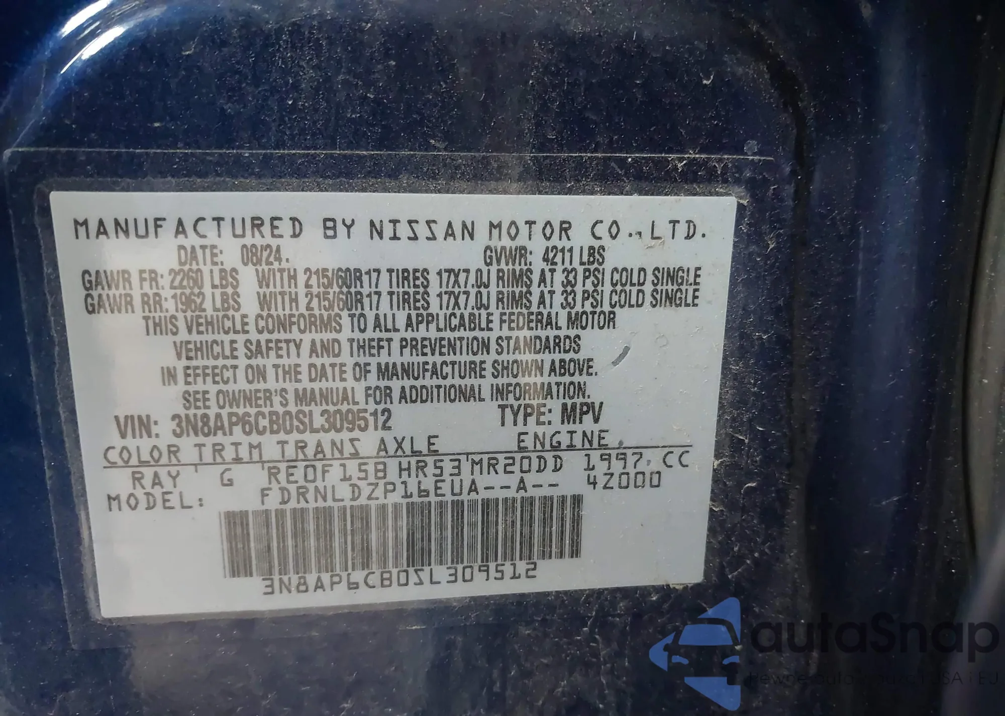 LOT: 43445479 VIN: 3N8AP6CB0SL309512
