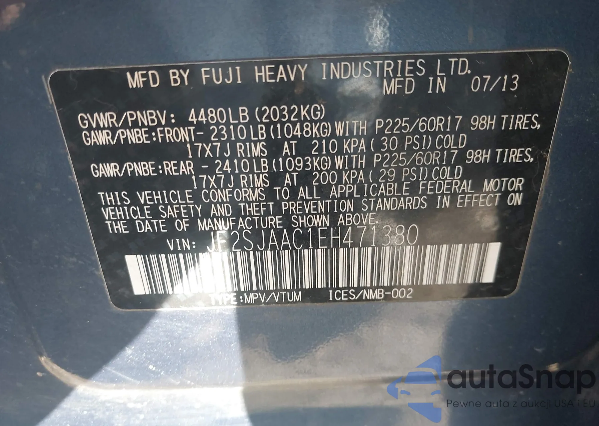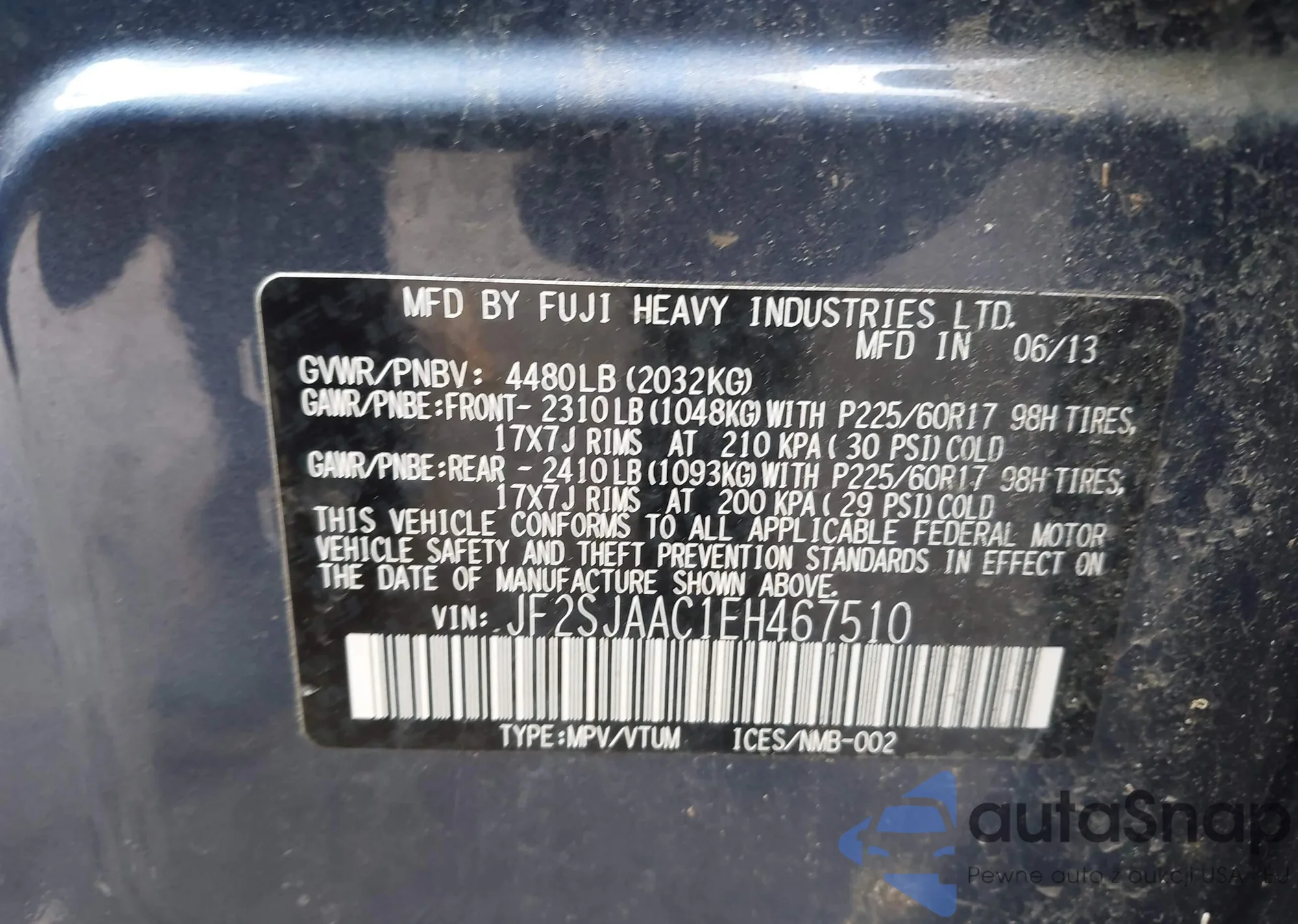 LOT: 43647520 VIN: JF2SJAAC1EH467510