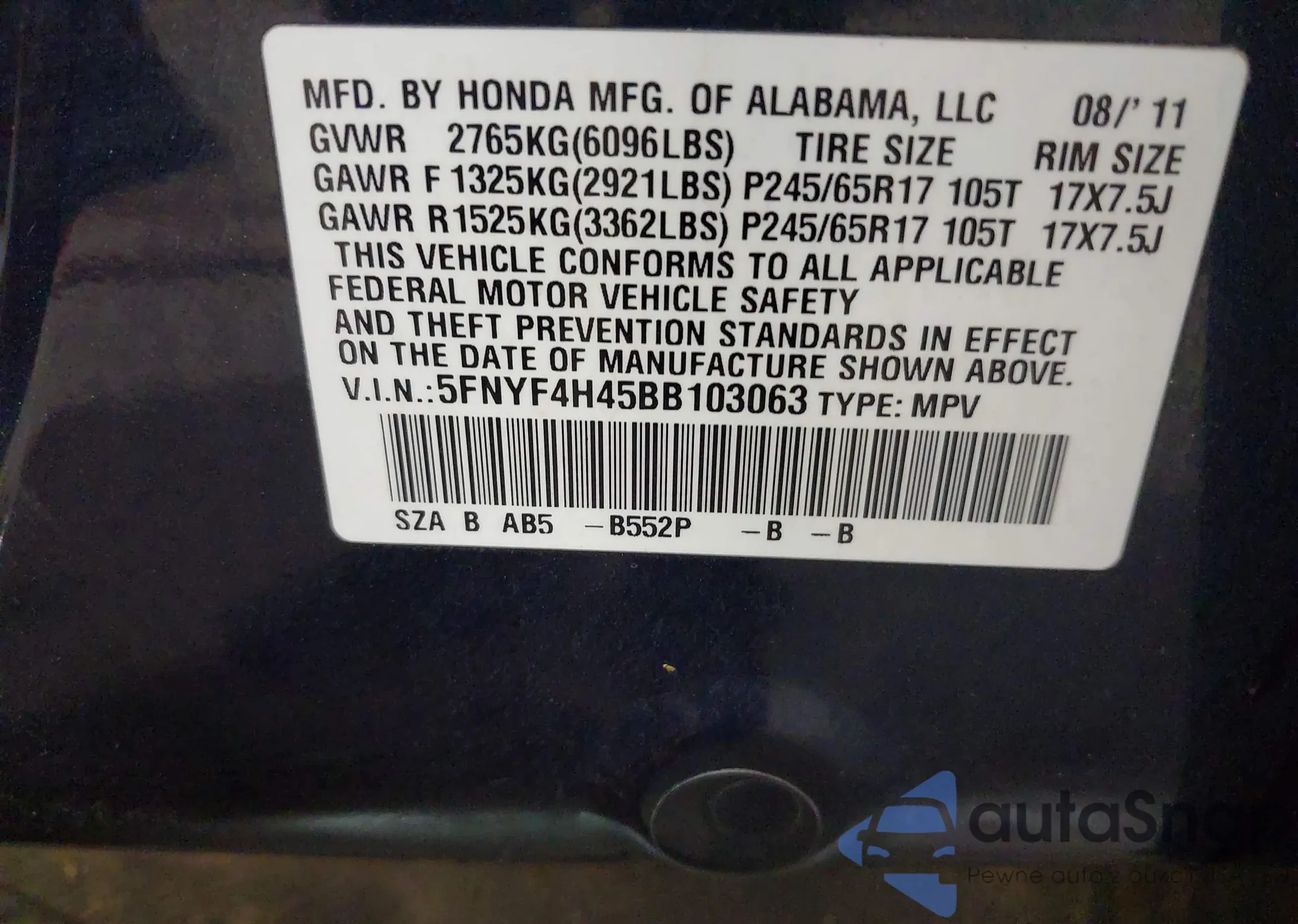 • VIN 5FNYF4H45BB103063