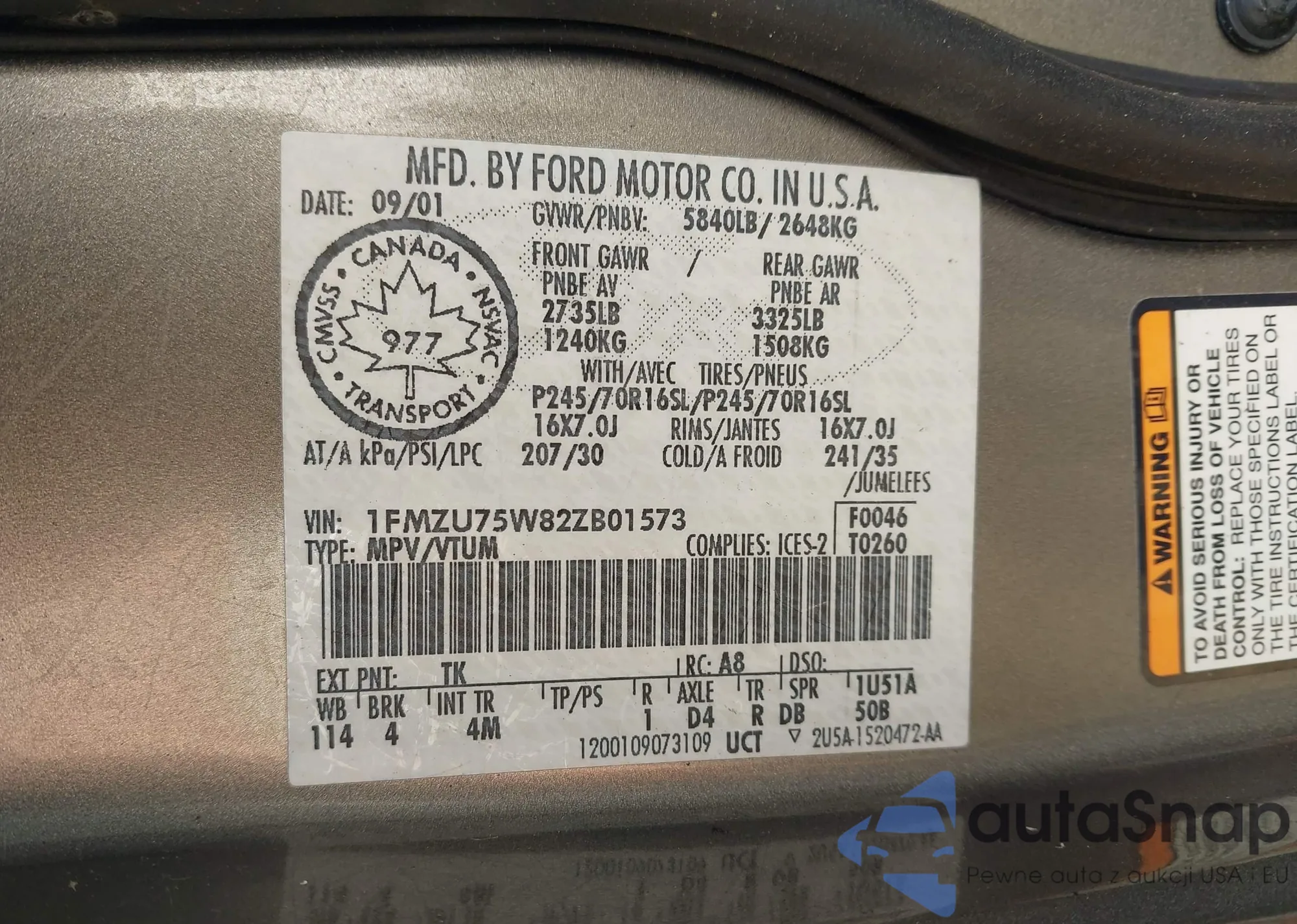 • VIN 1FMZU75W82ZB01573