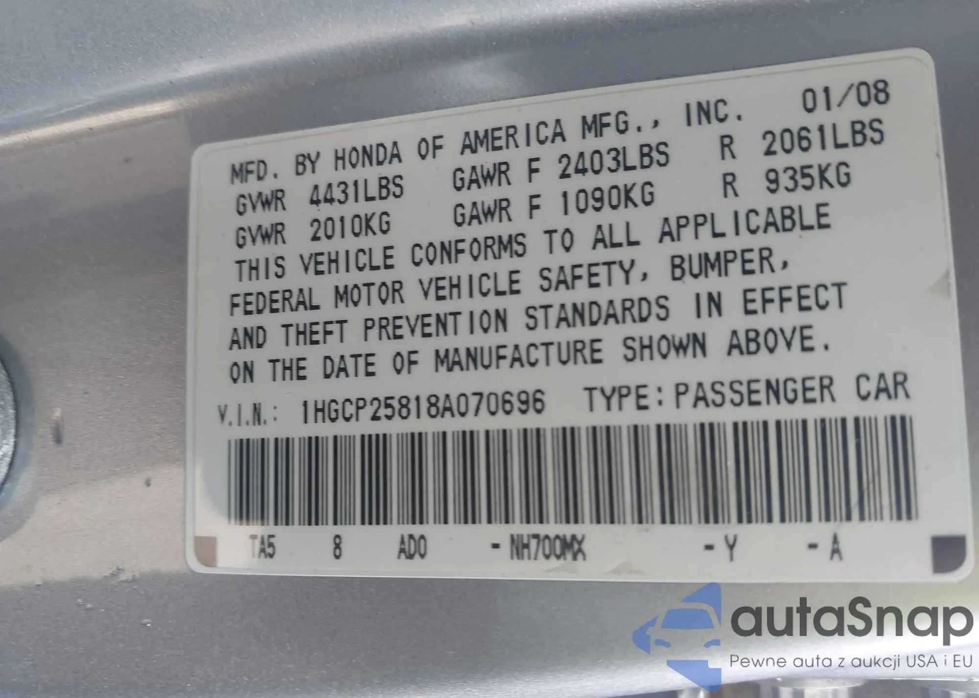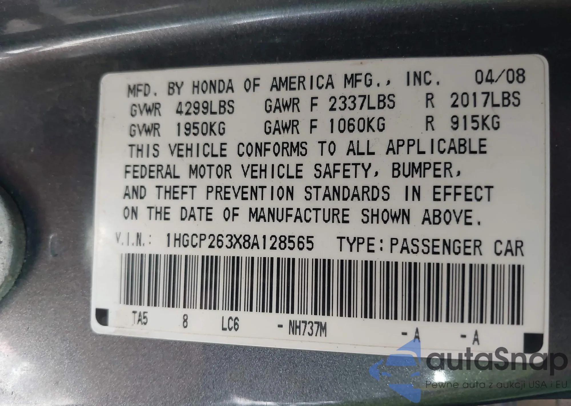 • VIN 1HGCP263X8A128565