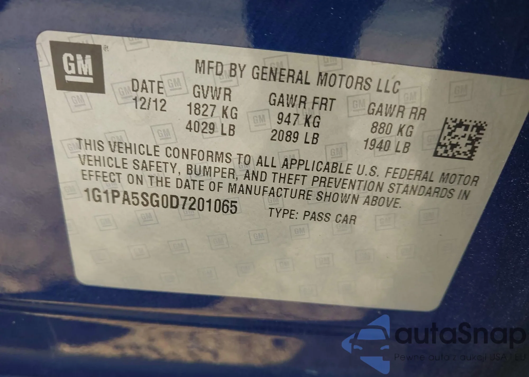 LOT: 43687357 VIN: 1G1PA5SG0D7201065