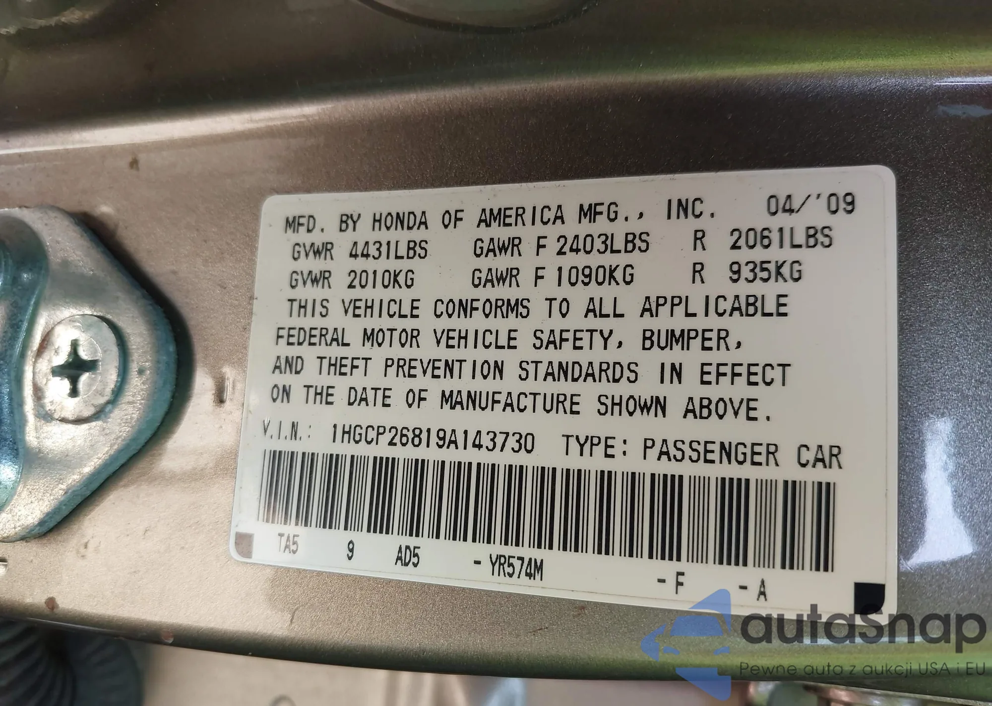LOT: 43239904 VIN: 1HGCP26819A143730
