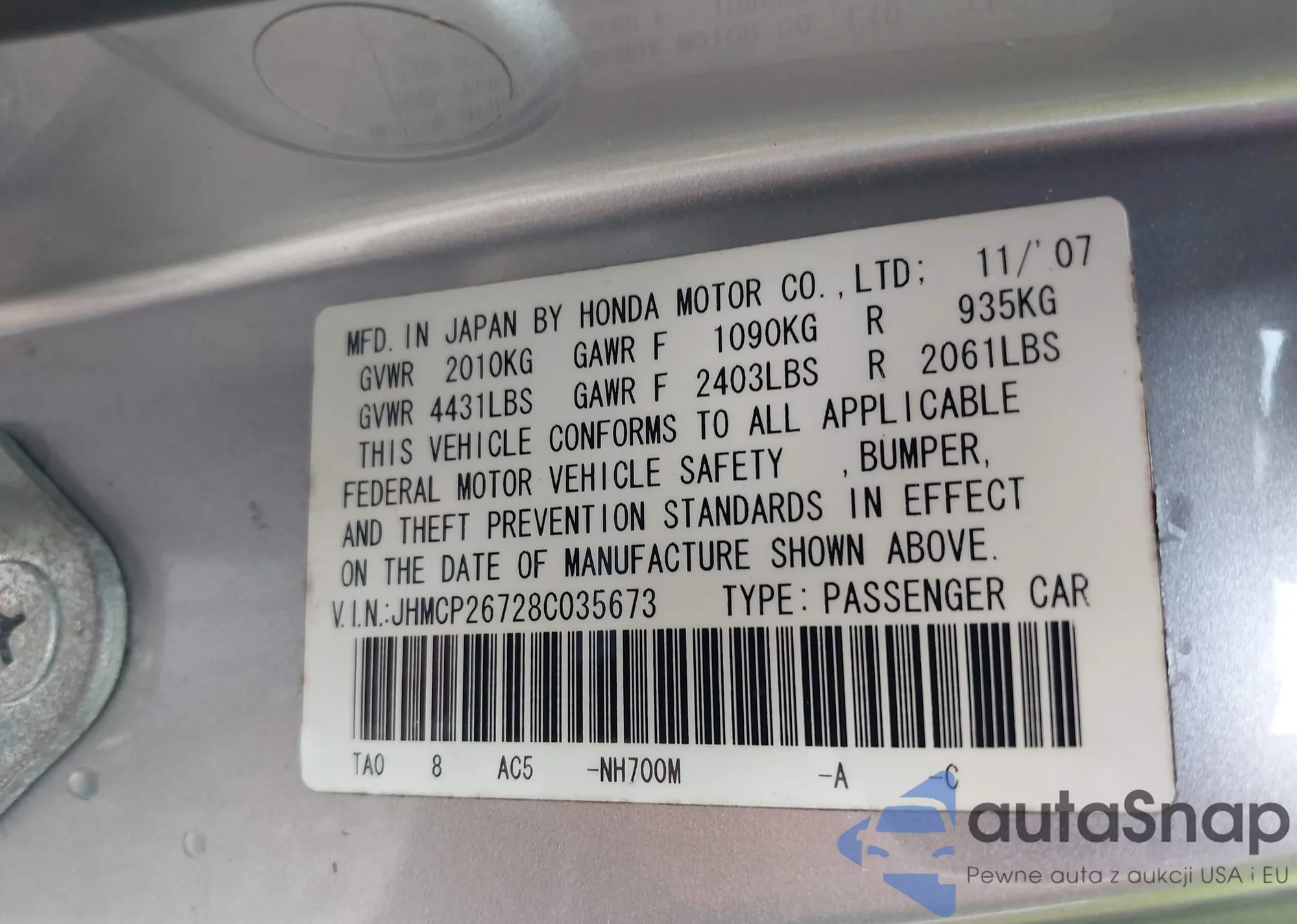 • VIN JHMCP26728C035673