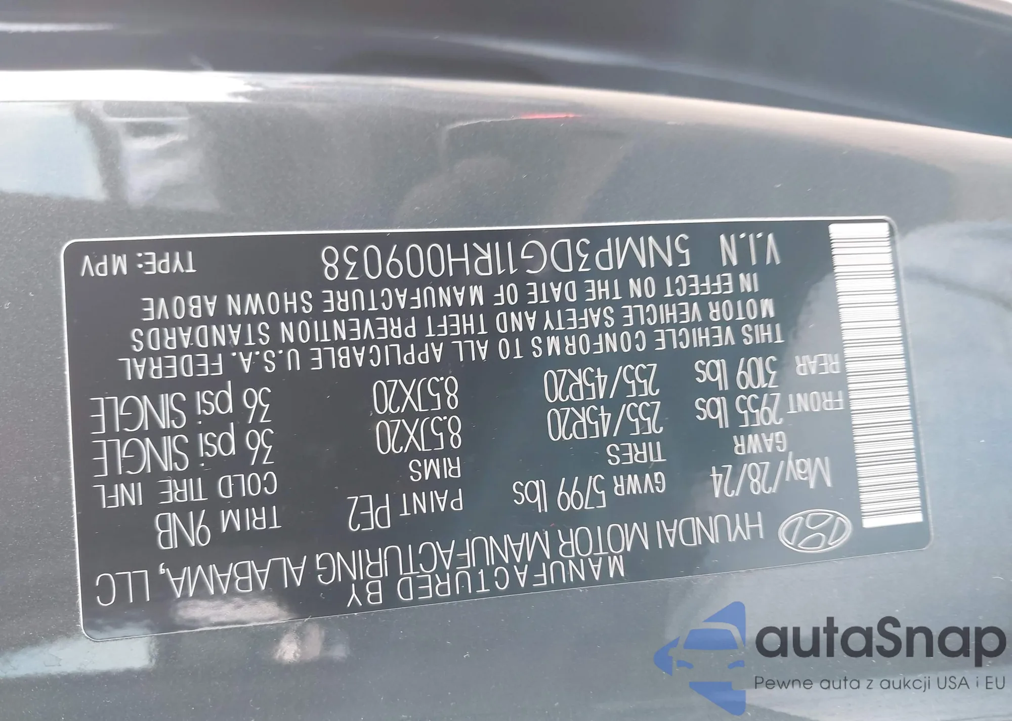 LOT: 43270346 VIN: 5NMP3DG11RH009038