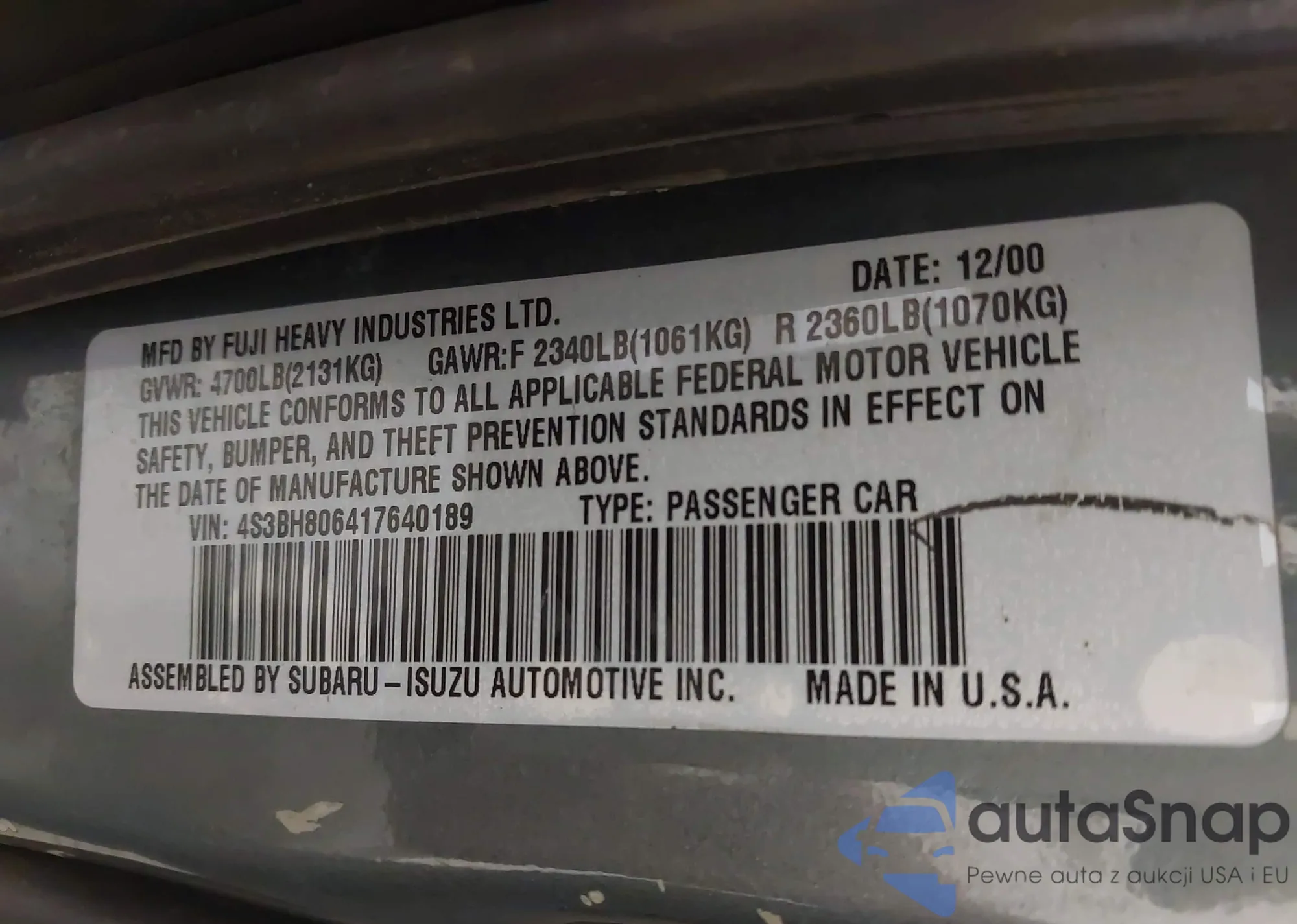 LOT: 43571844 VIN: 4S3BH806417640189