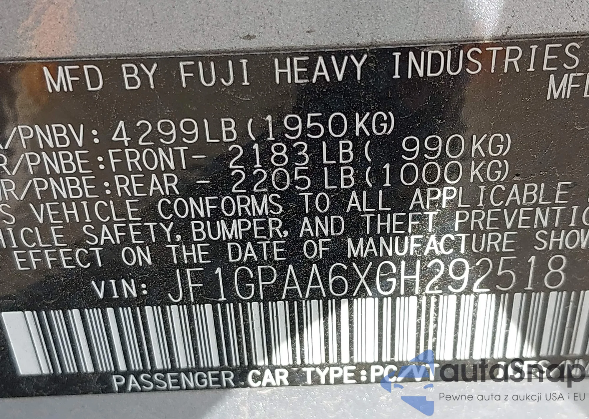 • VIN JF1GPAA6XGH292518