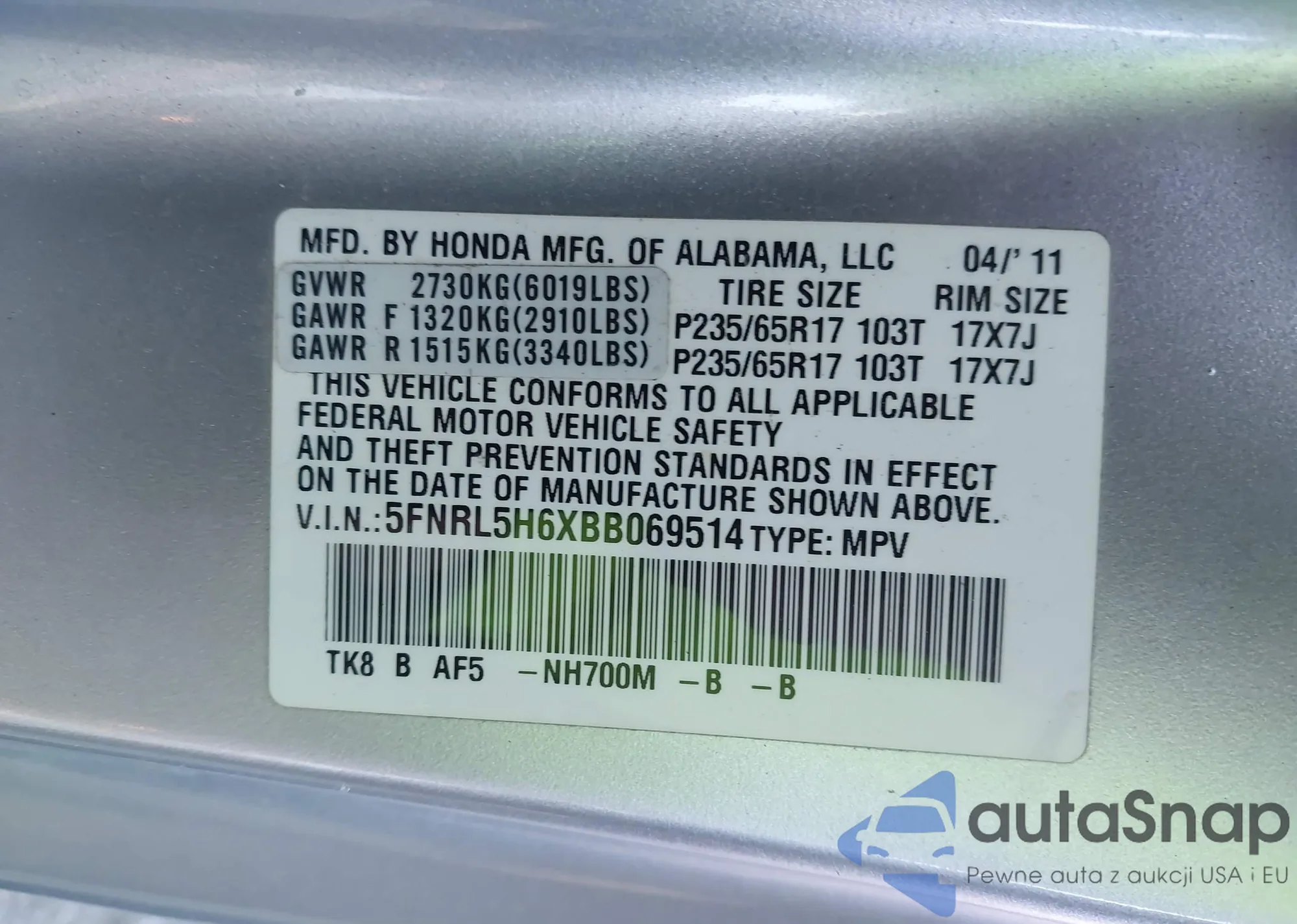 LOT: 43601641 VIN: 1HGCR2F37FA267513