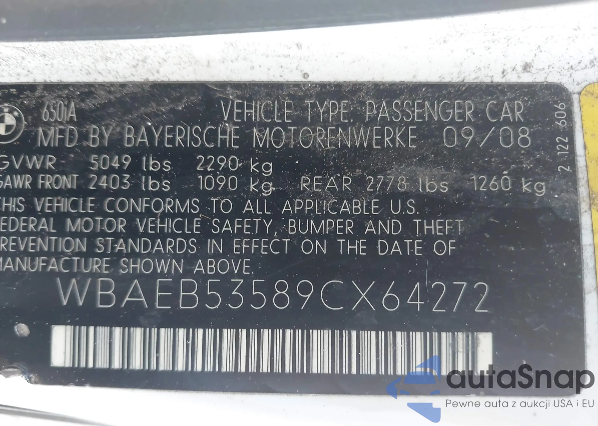LOT: 43562663 VIN: WBAEB53589CX64272