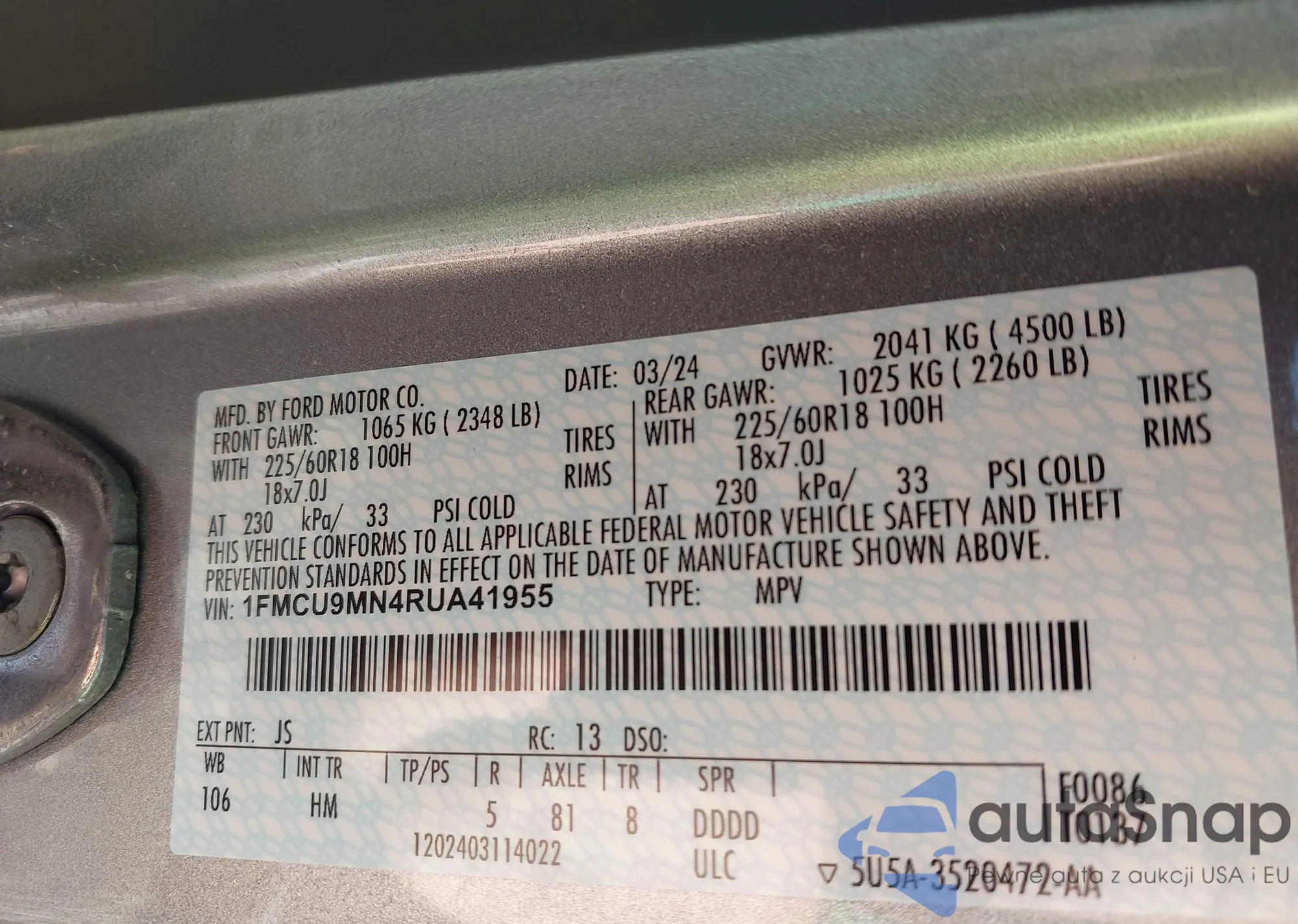 • VIN 1FMCU9MN4RUA41955