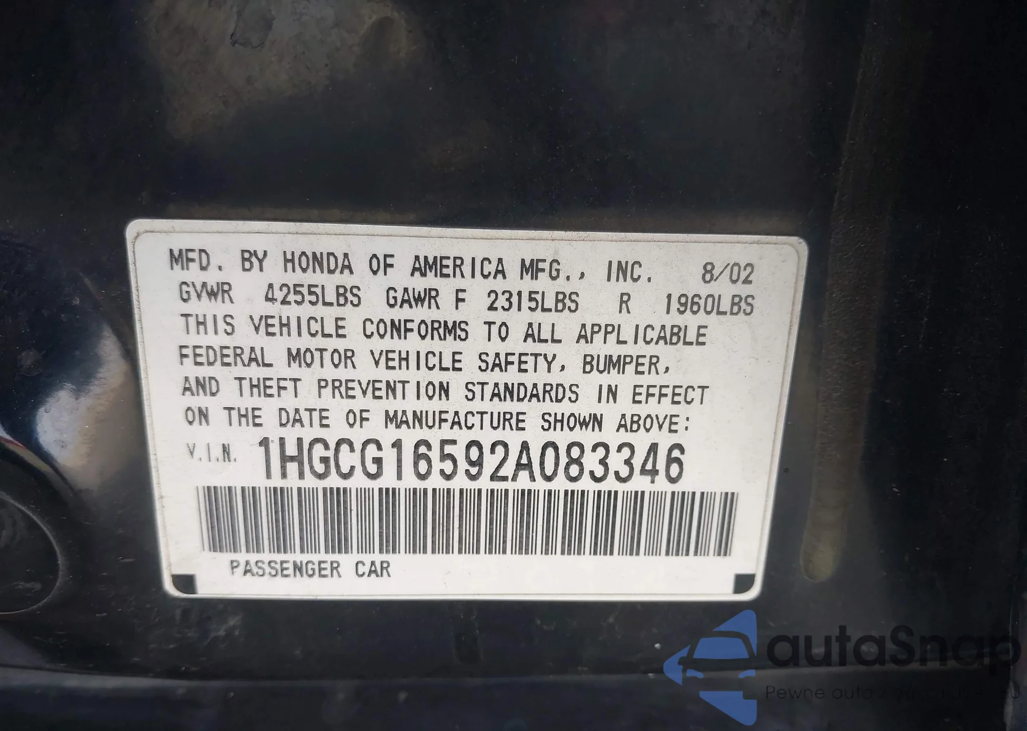 LOT: 43458211 VIN: 1HGCG16592A083346