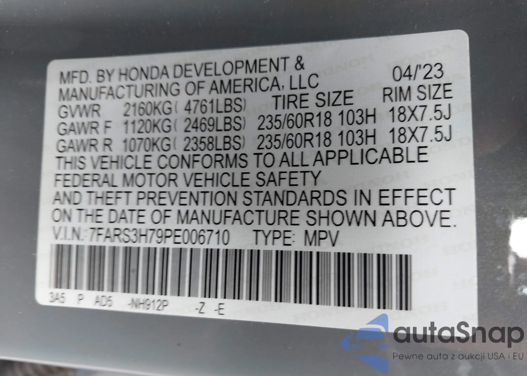 LOT: 43419277 VIN: 7FARS3H79PE006710
