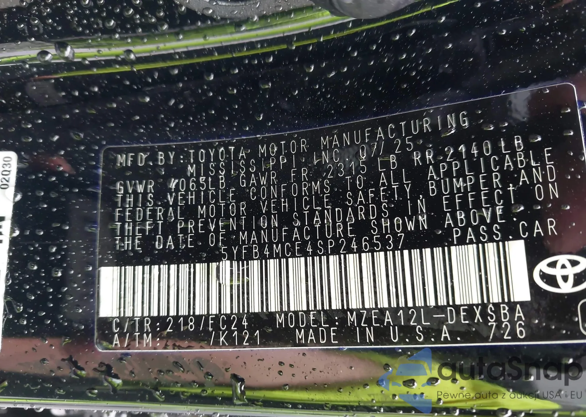 • VIN 5YFB4MCE4SP246537