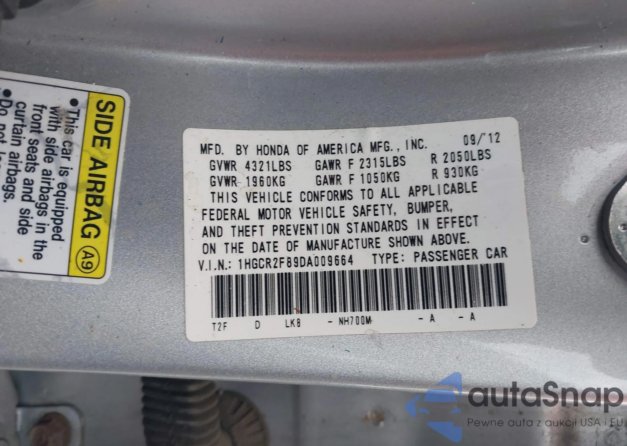 • VIN 1HGCR2F89DA009664