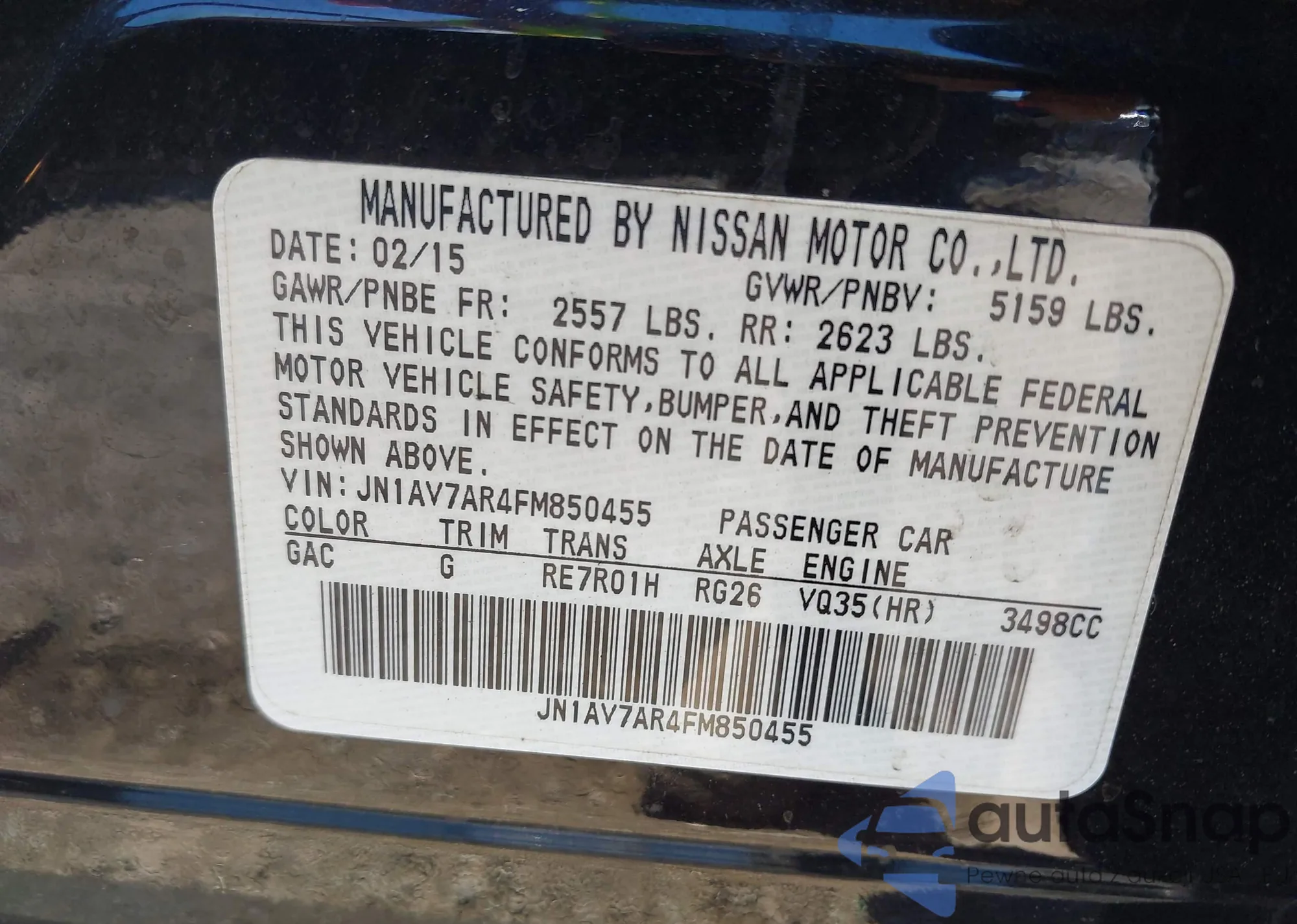 LOT: 43334095 VIN: JN1AV7AR4FM850455