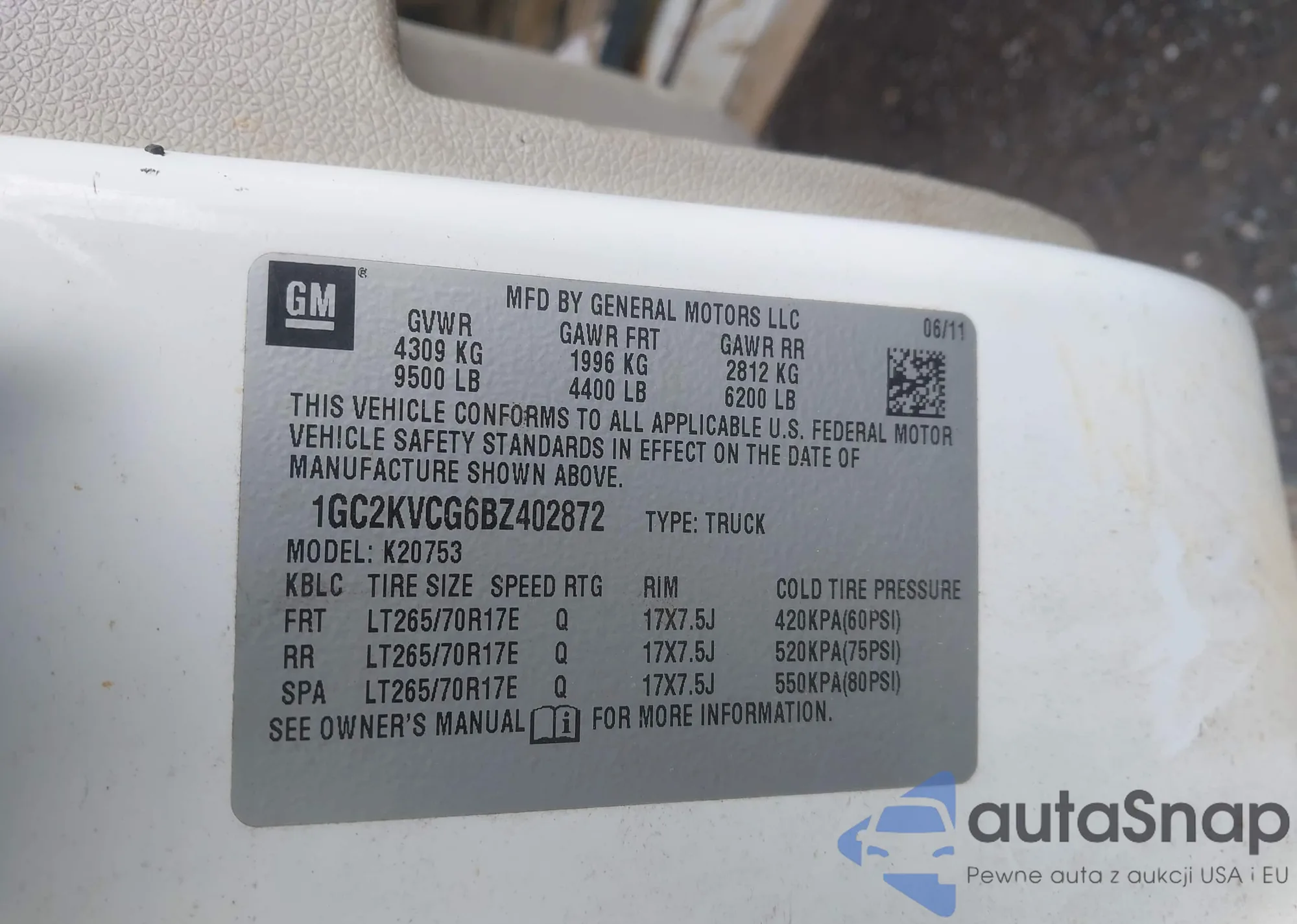• VIN 1GC2KVCG6BZ402872