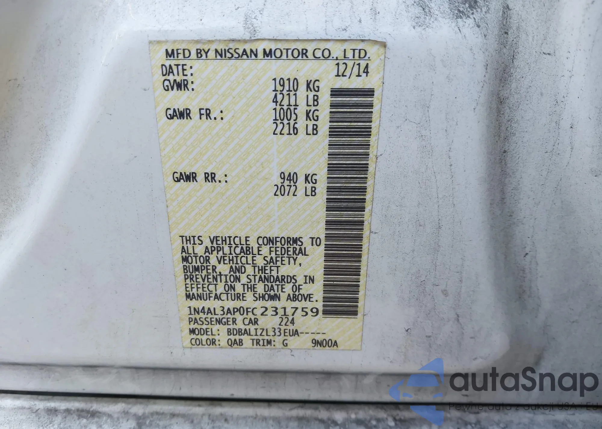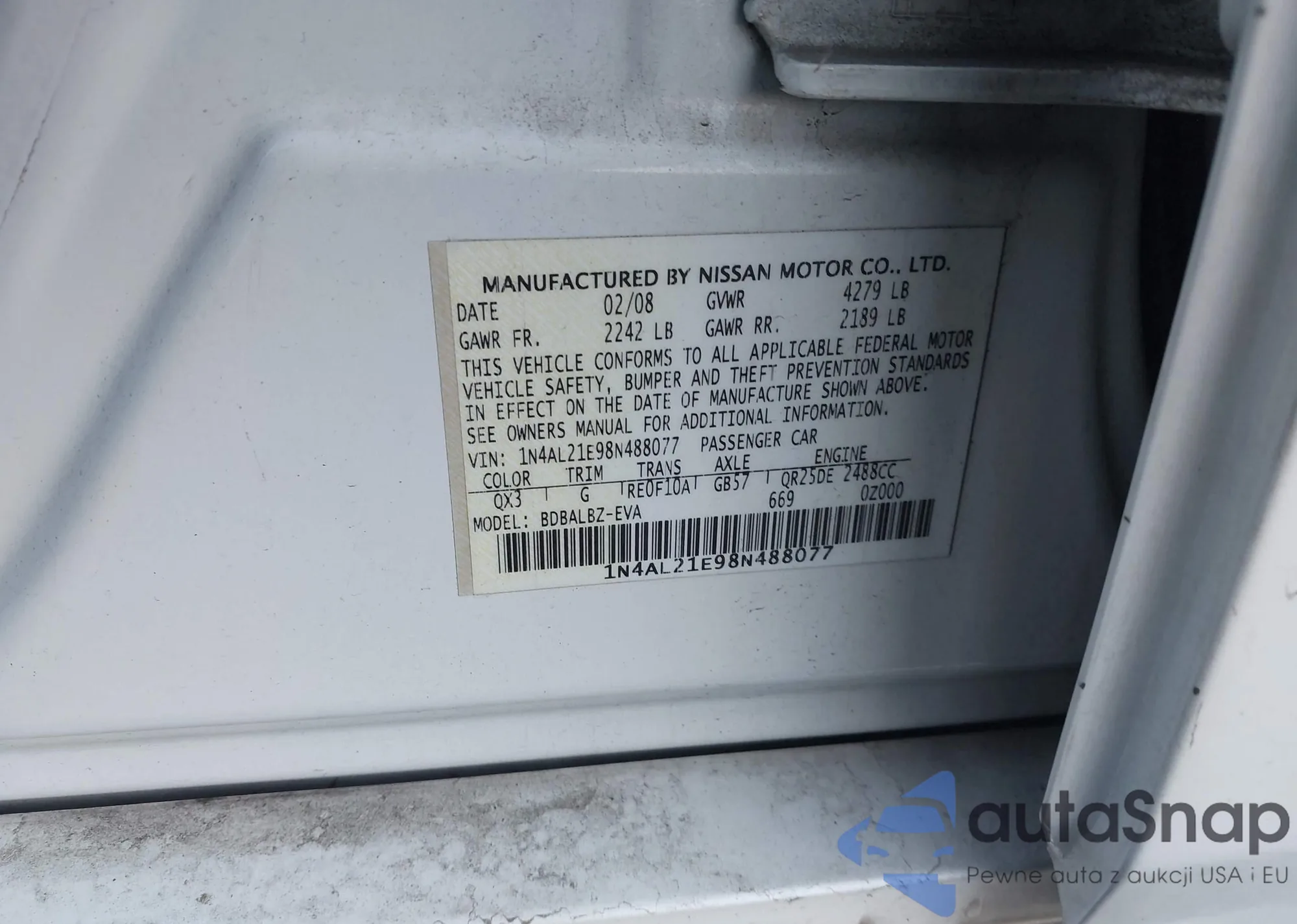 LOT: 43704794 VIN: 1N4AL21E98N488077