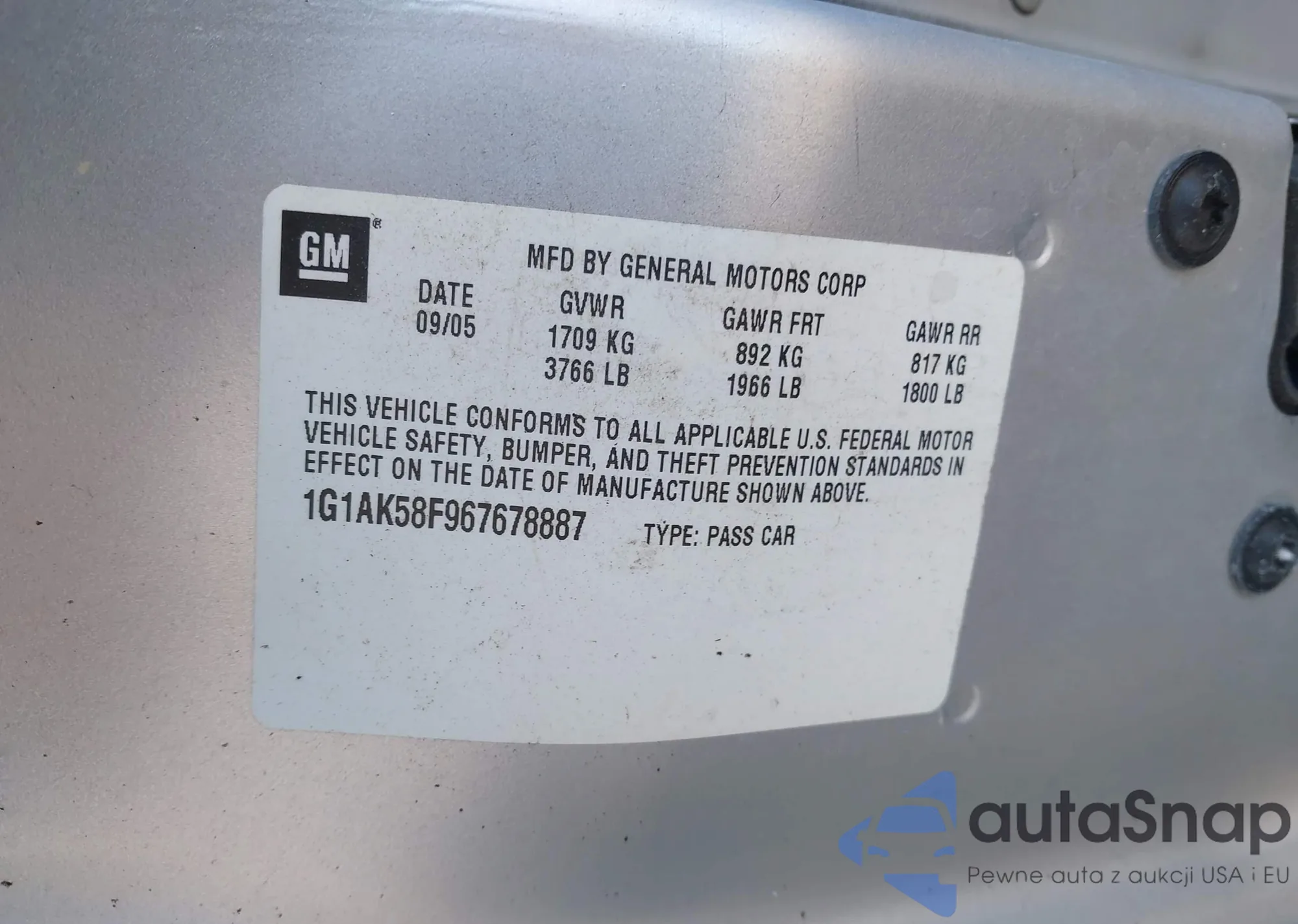 LOT: 43758006 VIN: 1G1AK58F967678887