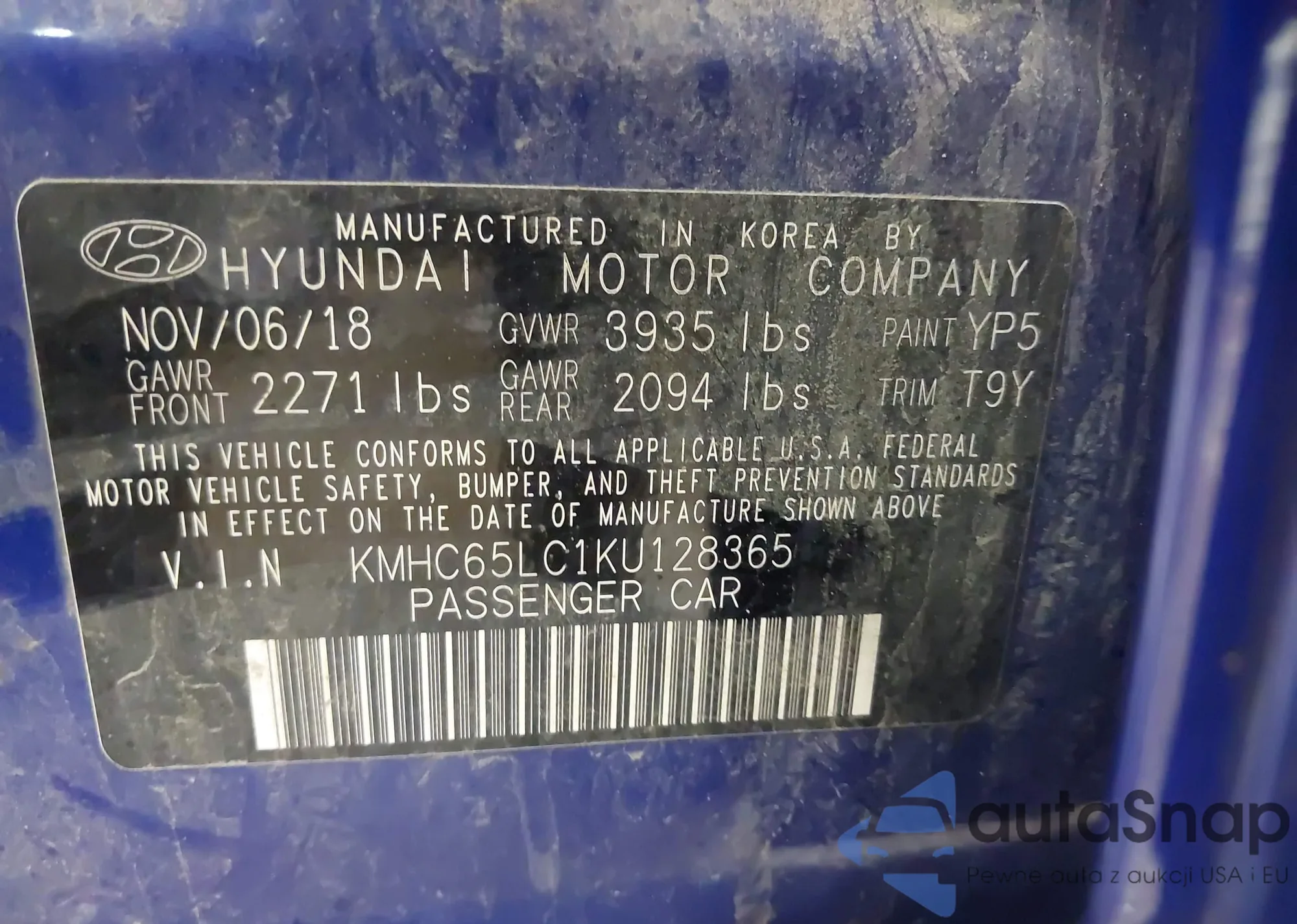 LOT: 43662577 VIN: KMHC65LC1KU128365