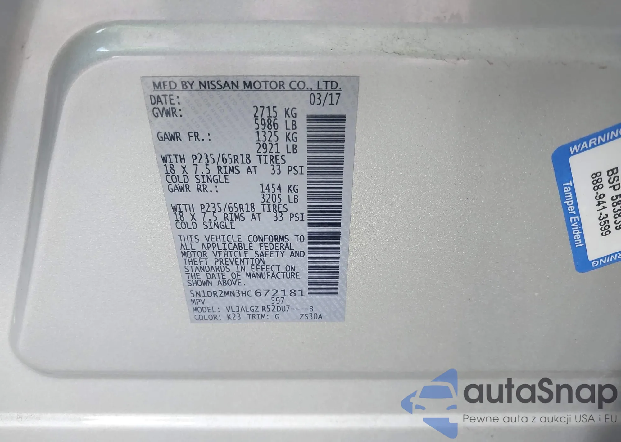 • VIN 5N1DR2MN3HC672181