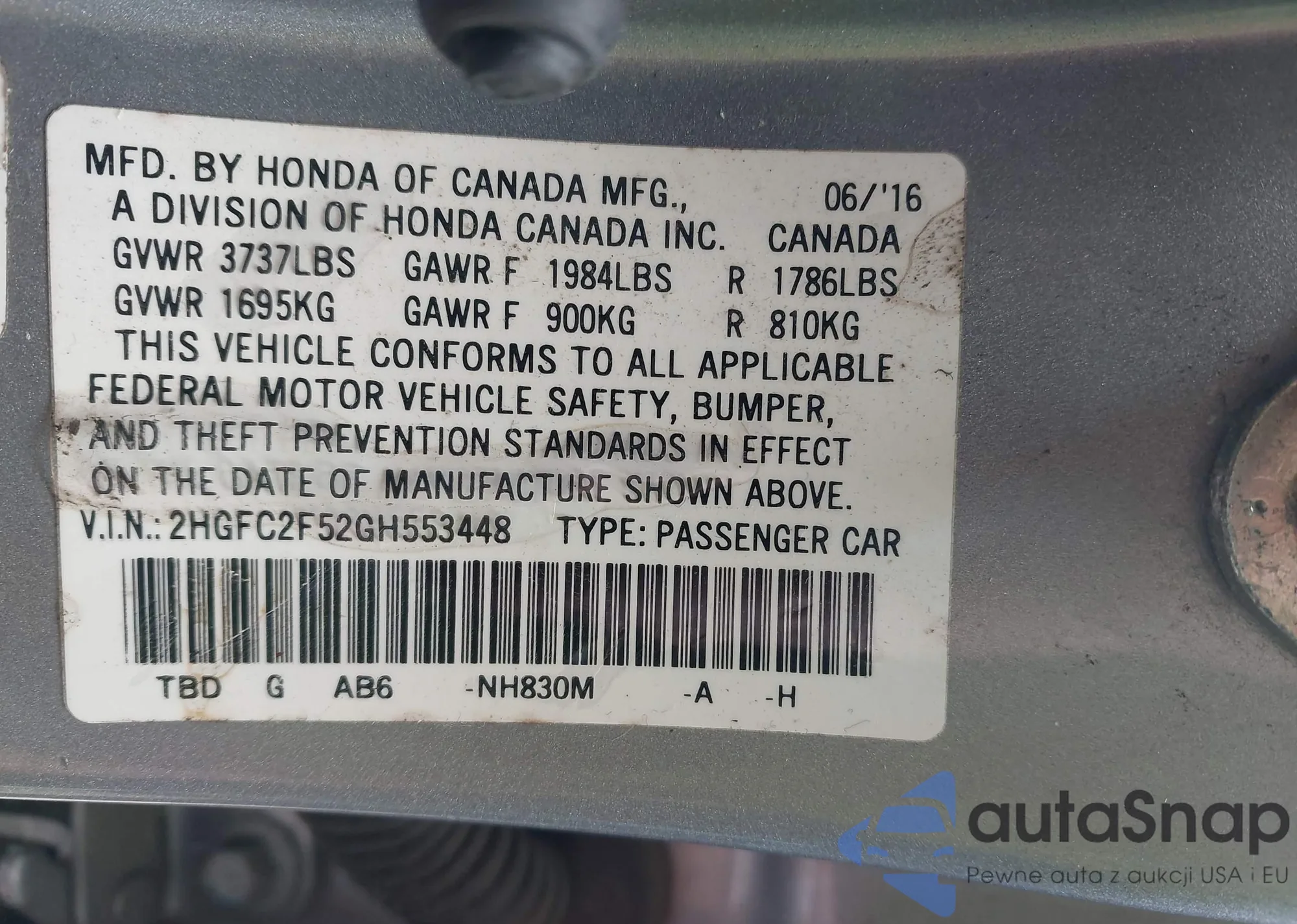 LOT: 43779940 VIN: 1HGCP26819A017402