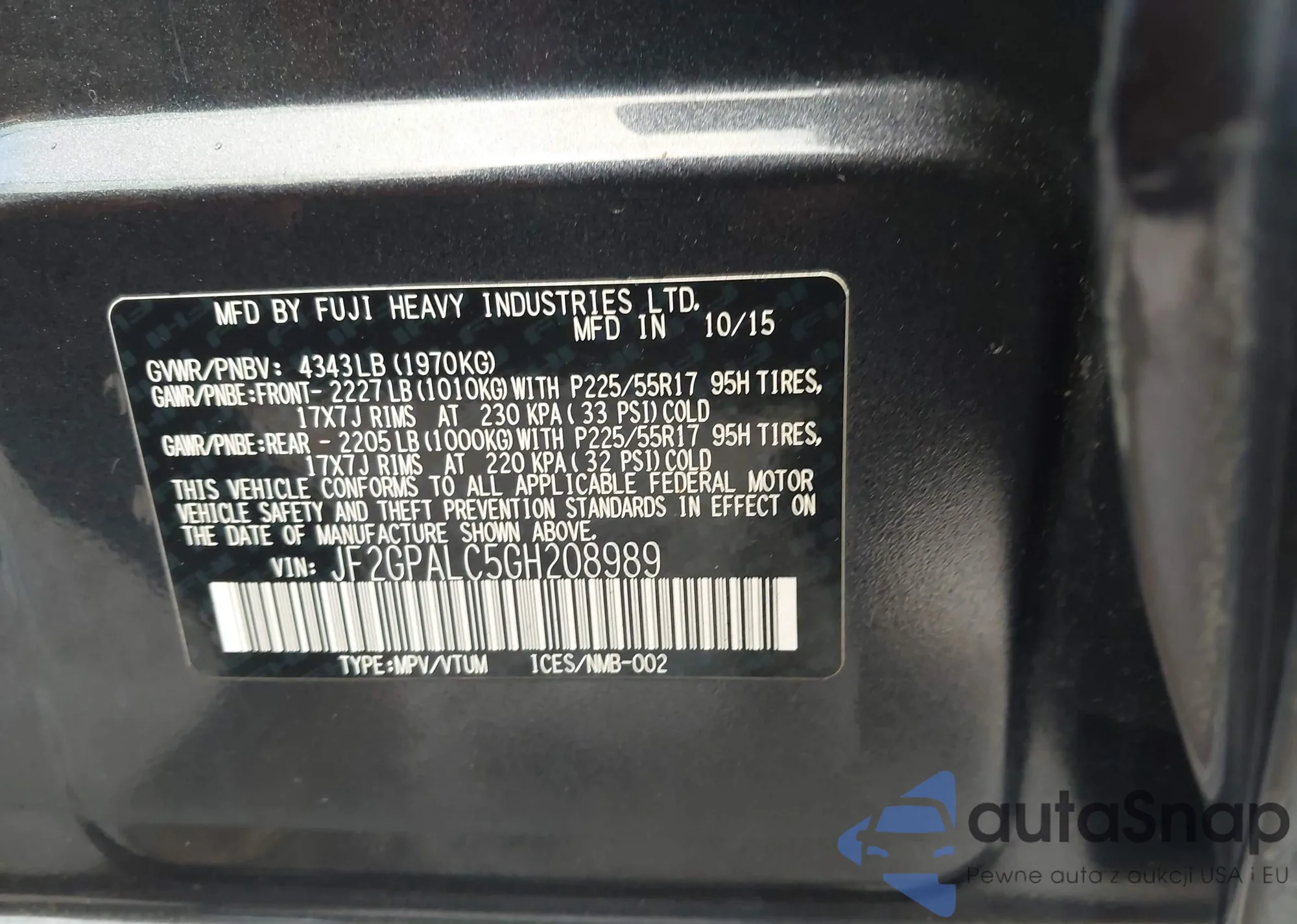 LOT: 43703149 VIN: JF2GPALC5GH208989