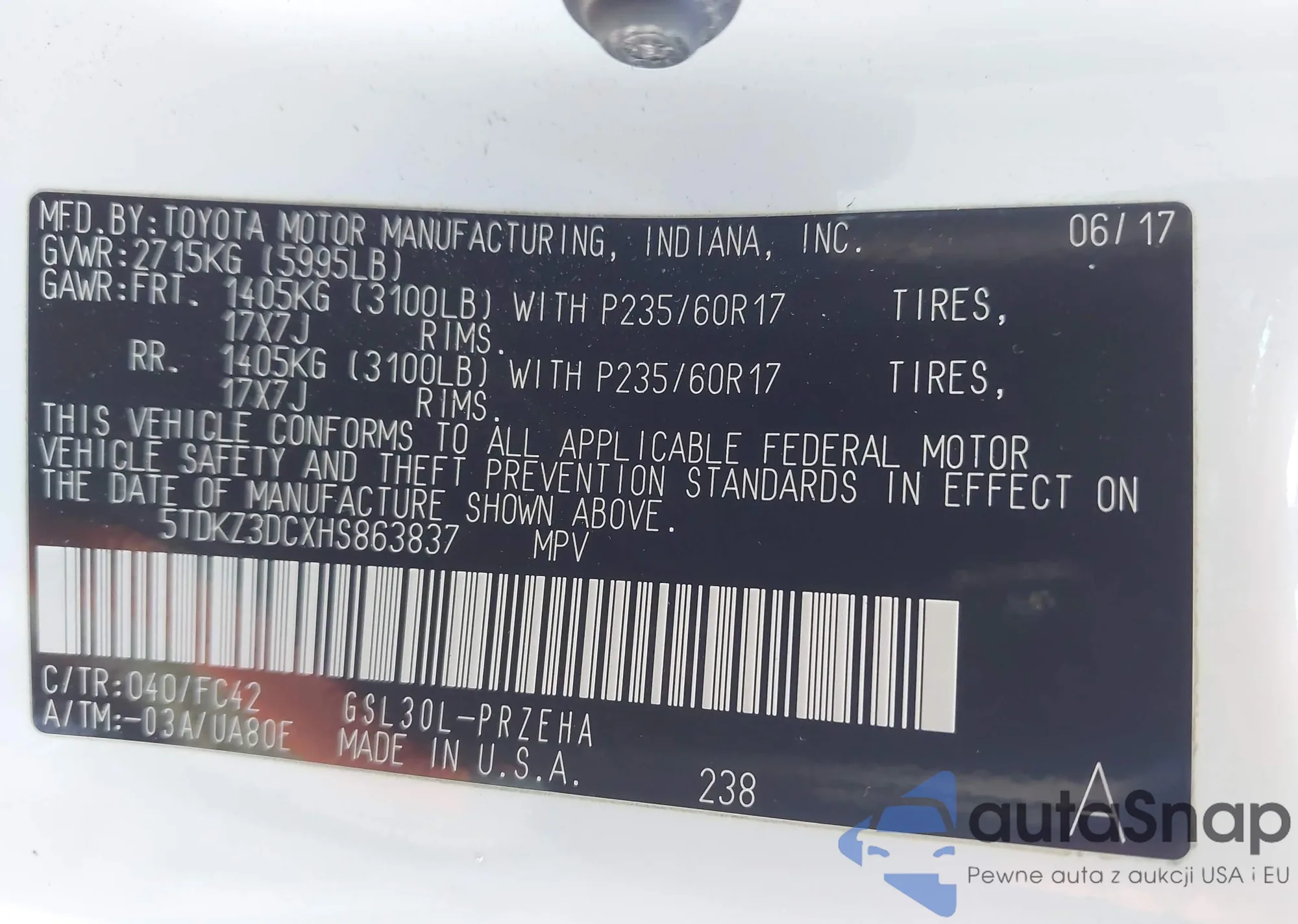 • VIN 5TDKZ3DCXHS863837
