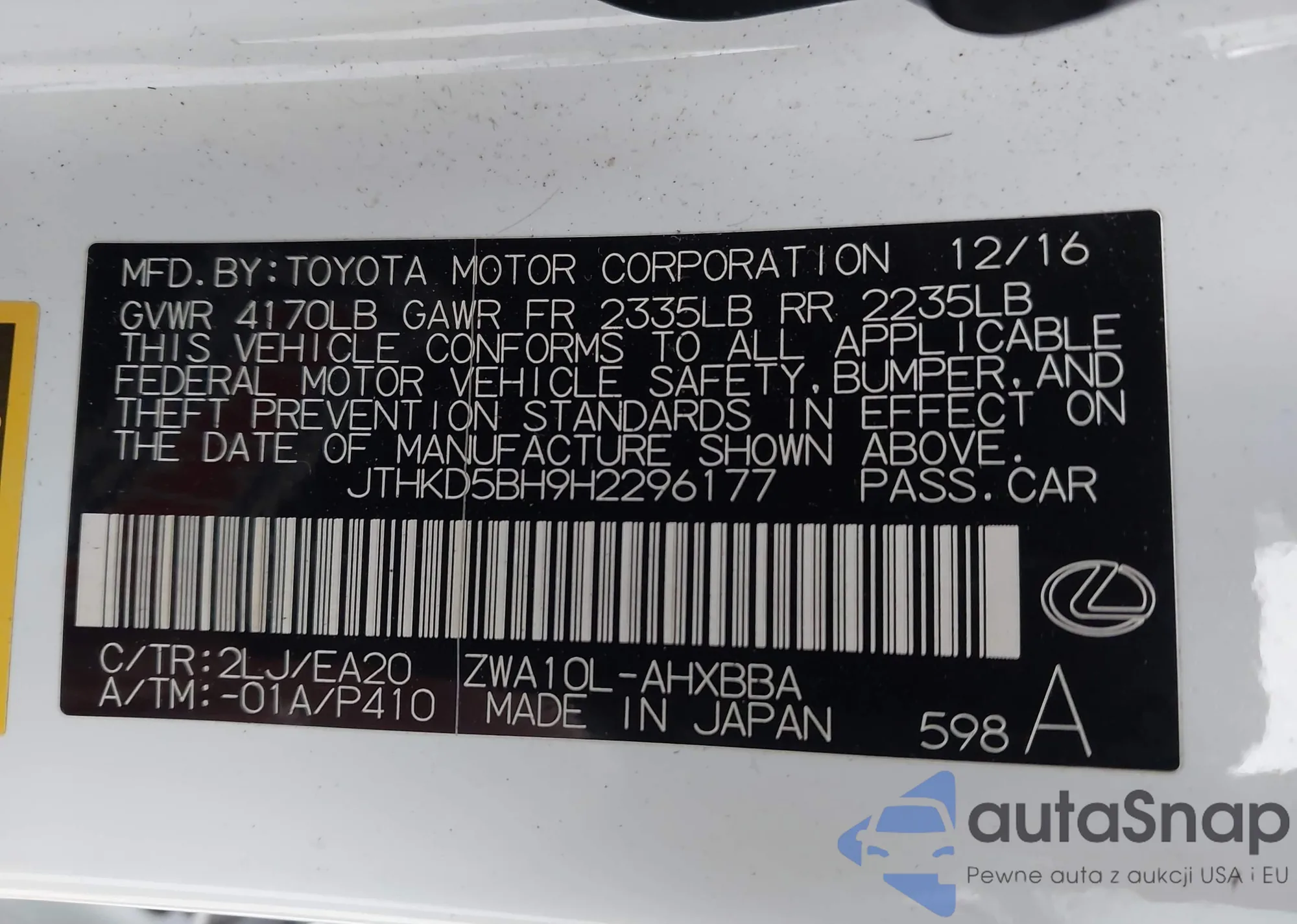 LOT: 43582842 VIN: JTHKD5BH9H2296177