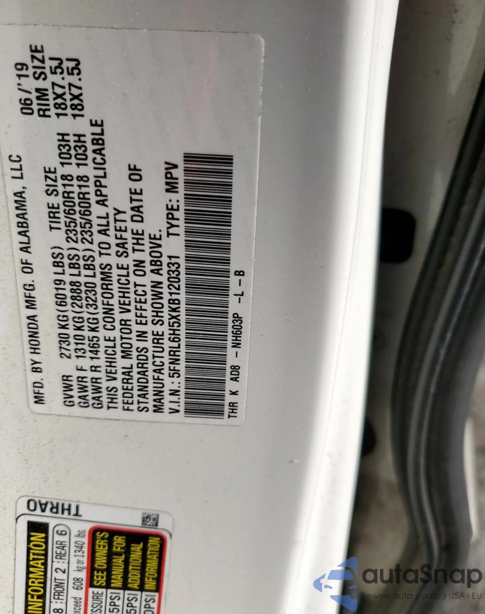 • VIN 5FNRL6H5XKB120331