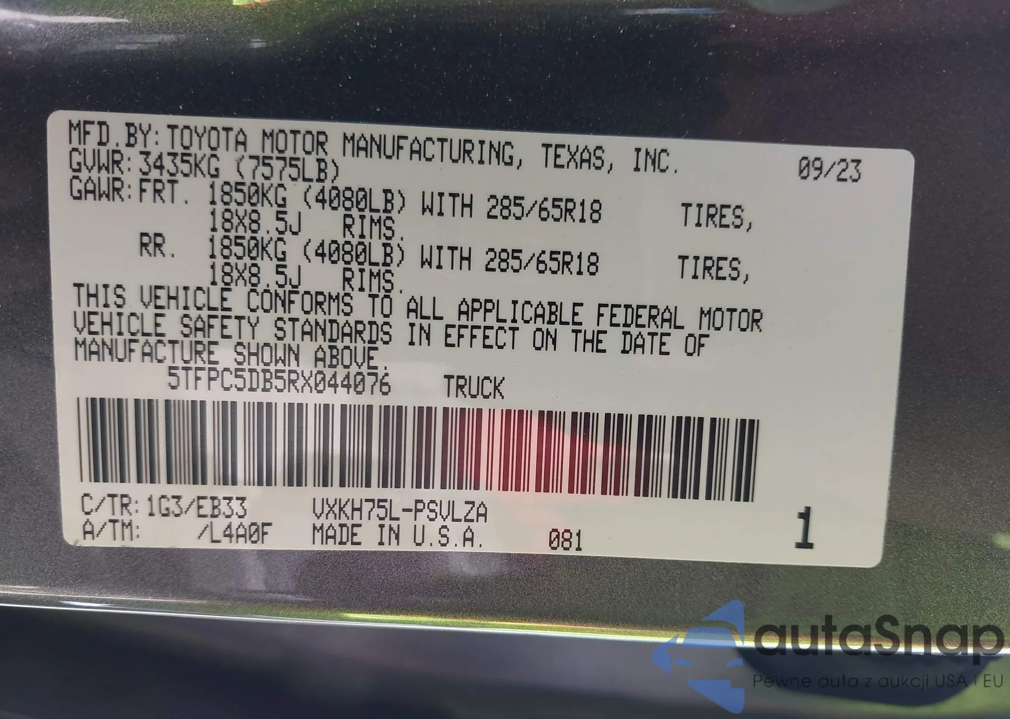 • VIN 5TFPC5DB5RX044076