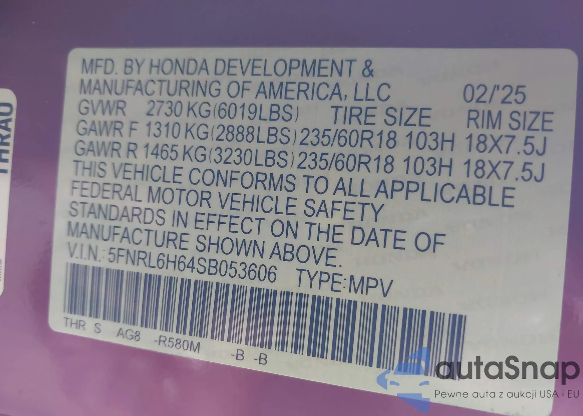 LOT: 43212587 VIN: 5FNRL6H64SB053606