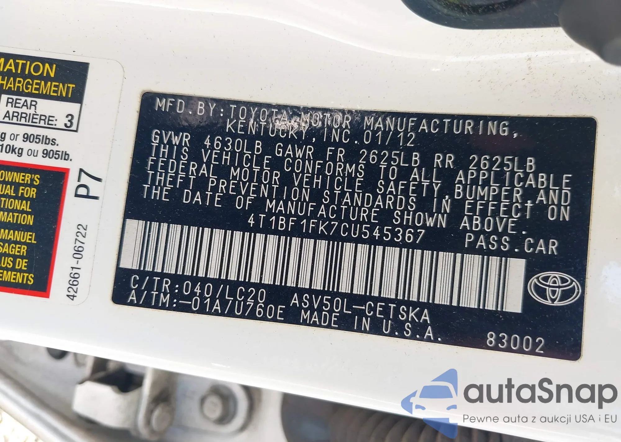 • VIN 4T1BF1FK7CU545367
