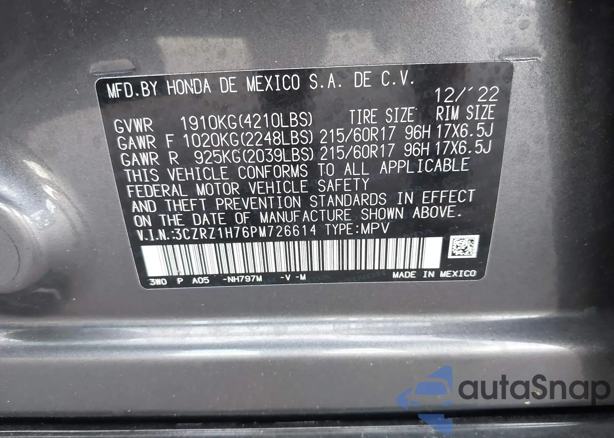 • VIN 3CZRZ1H76PM726614