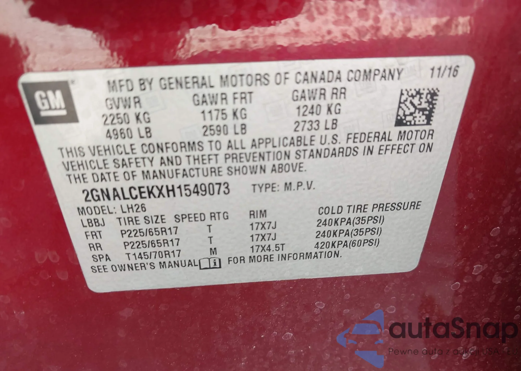 • VIN 2GNALCEKXH1549073