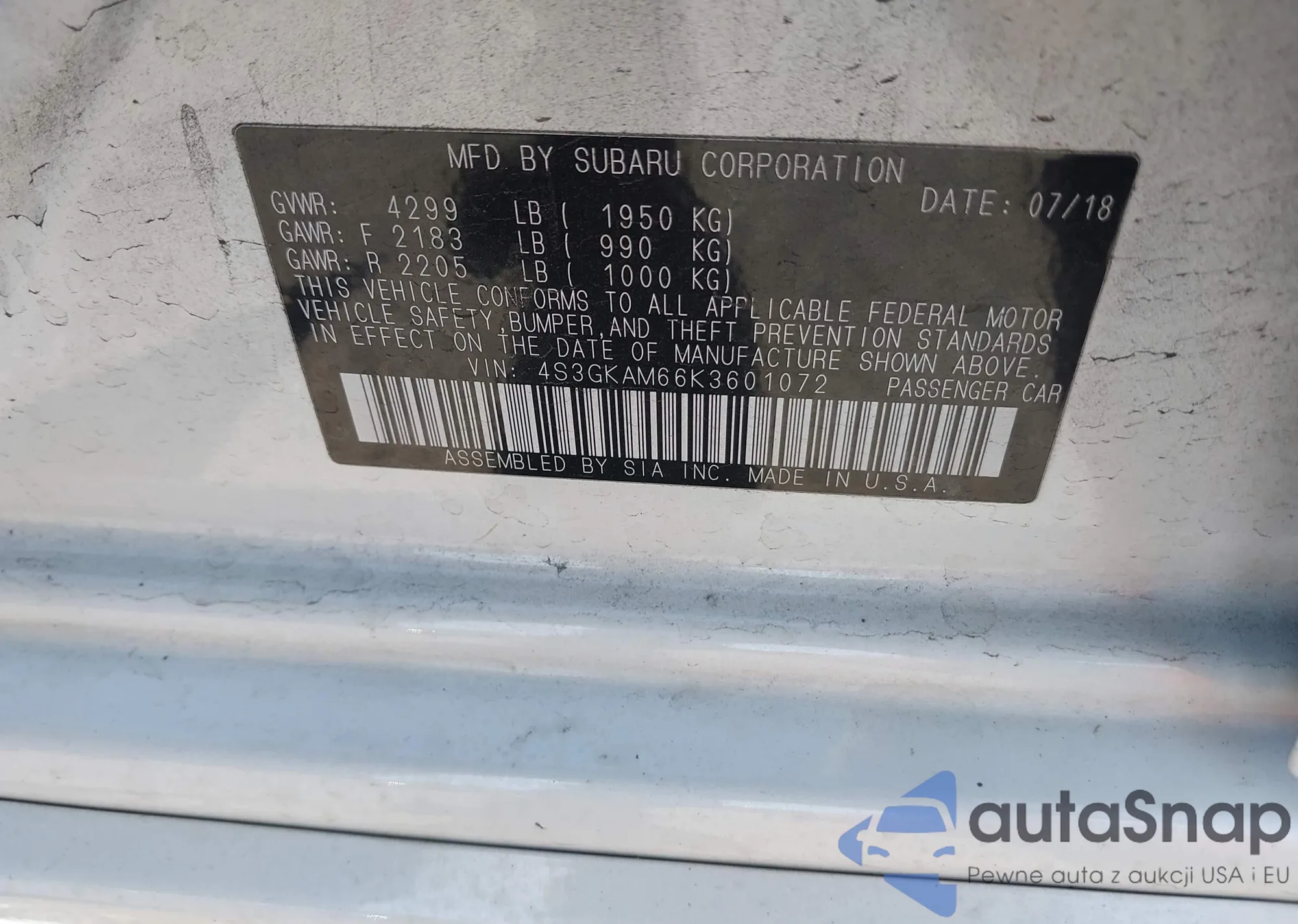 • VIN 4S3GKAM66K3601072