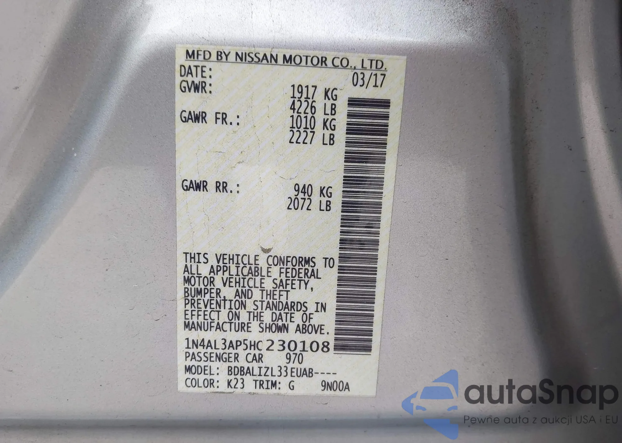 LOT: 43564674 VIN: 1N4AL3AP5HC230108