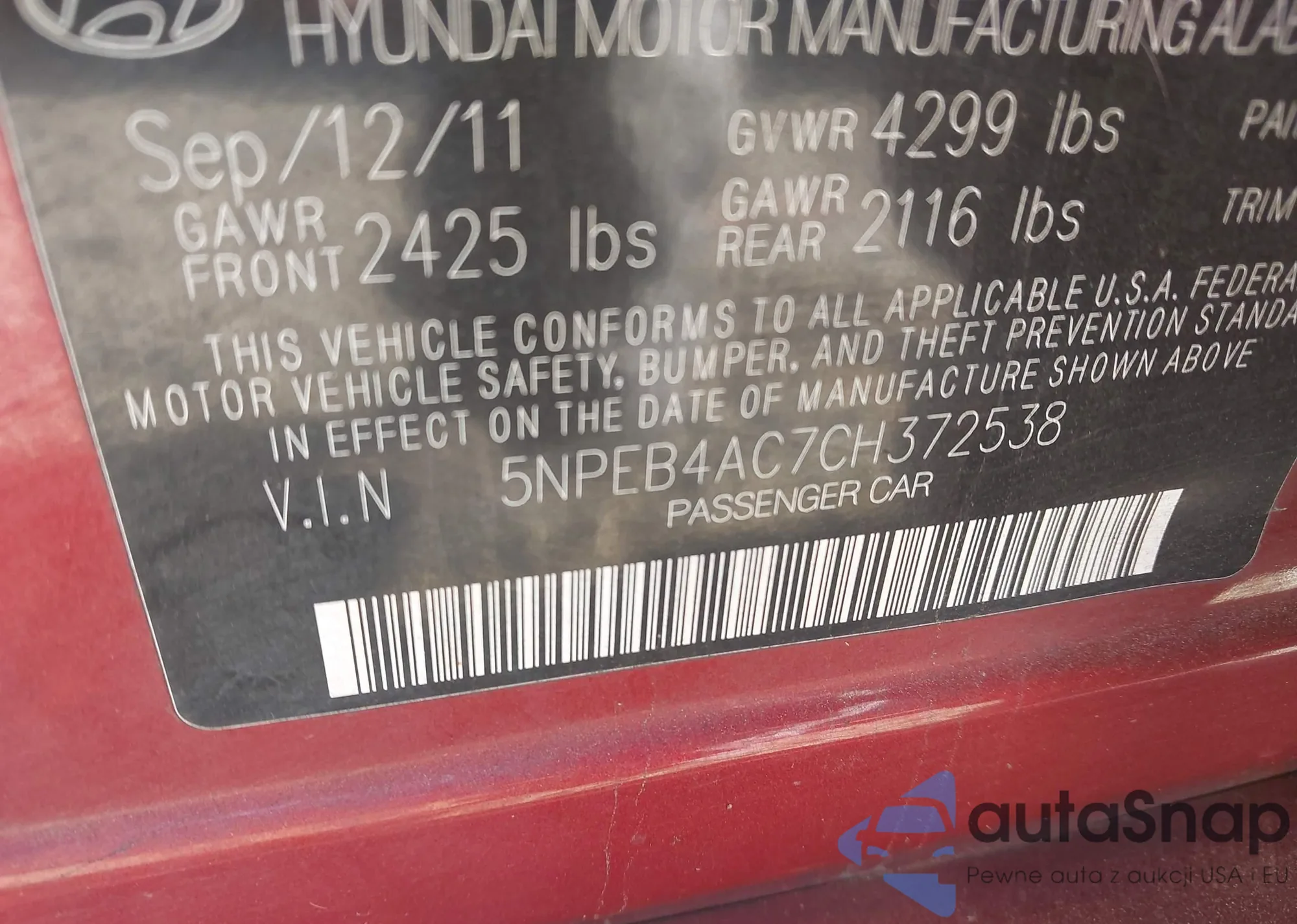 2012 Hyundai Sonata Gls z USA, uszkodzony, nr VIN 5NPEB4AC7CH372538