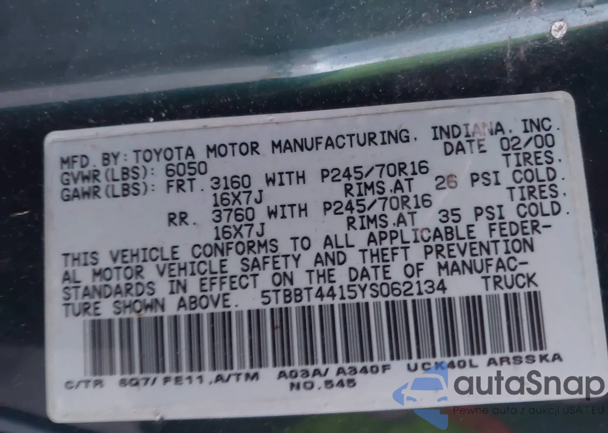 LOT: 43707027 VIN: 5TBBT4415YS062134