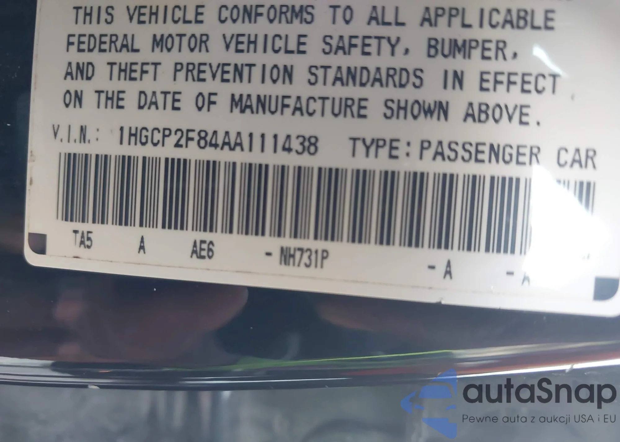 • VIN 1HGCP2F84AA111438