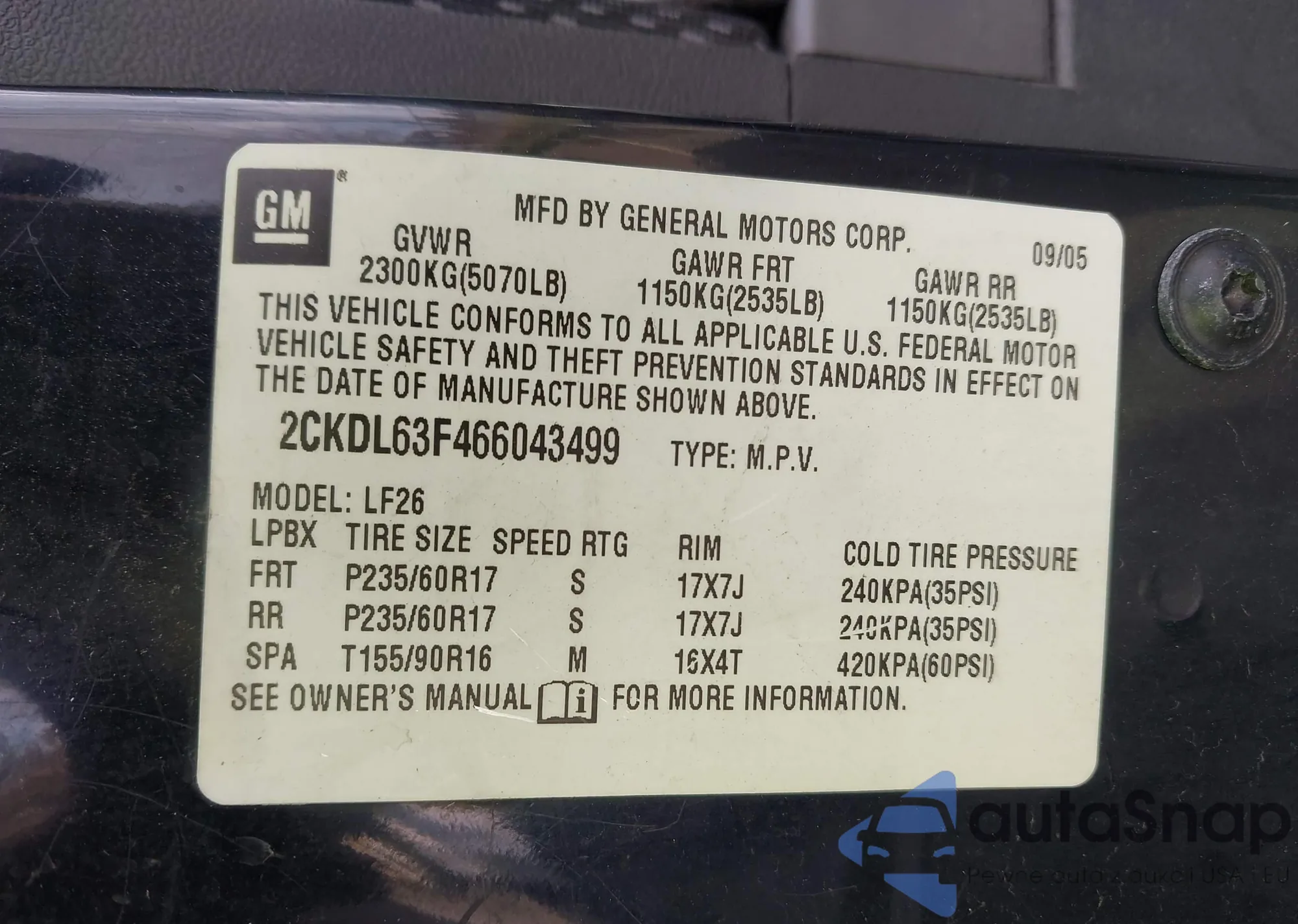 • VIN 2CKDL63F466043499