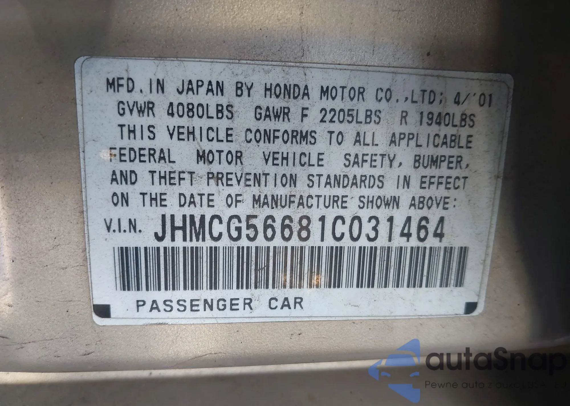LOT: 43727046 VIN: JHMCG56681C031464
