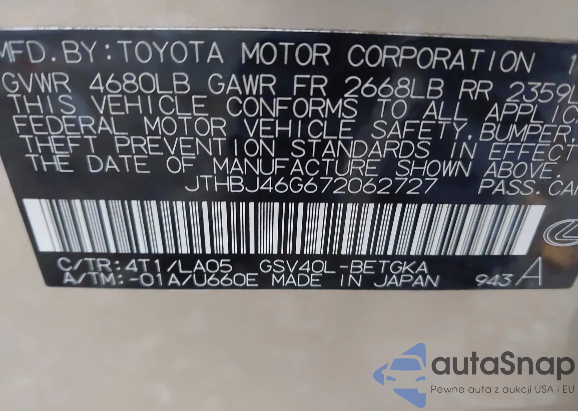 LOT: 43768145 VIN: JTHBJ46G672062727