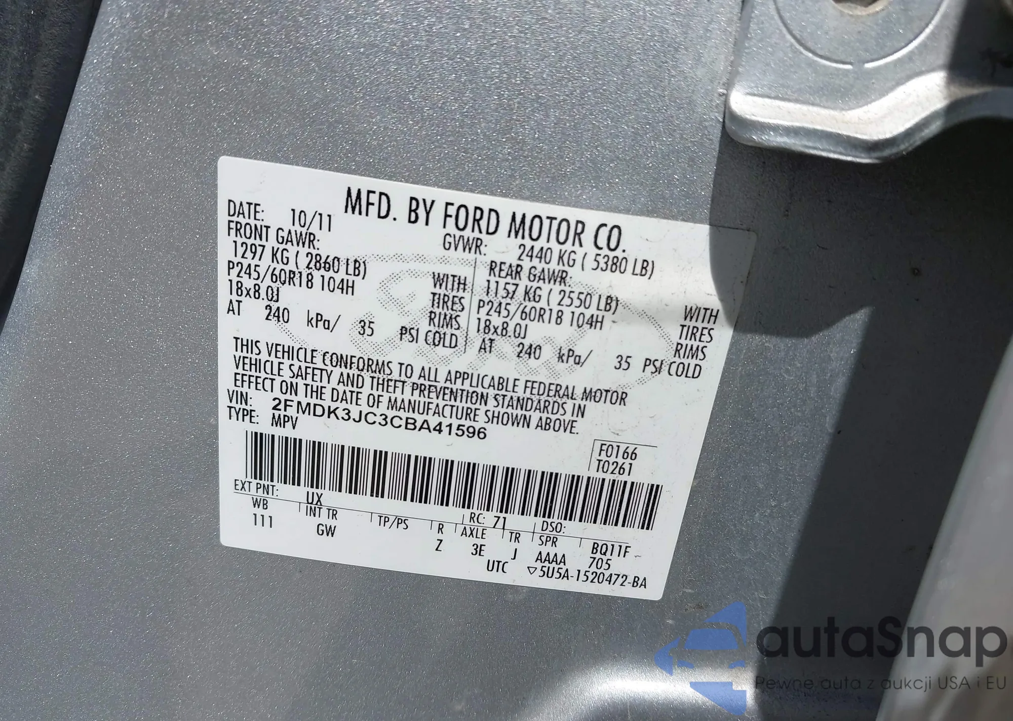 LOT: 42540139 VIN: 2FMDK3JC3CBA41596