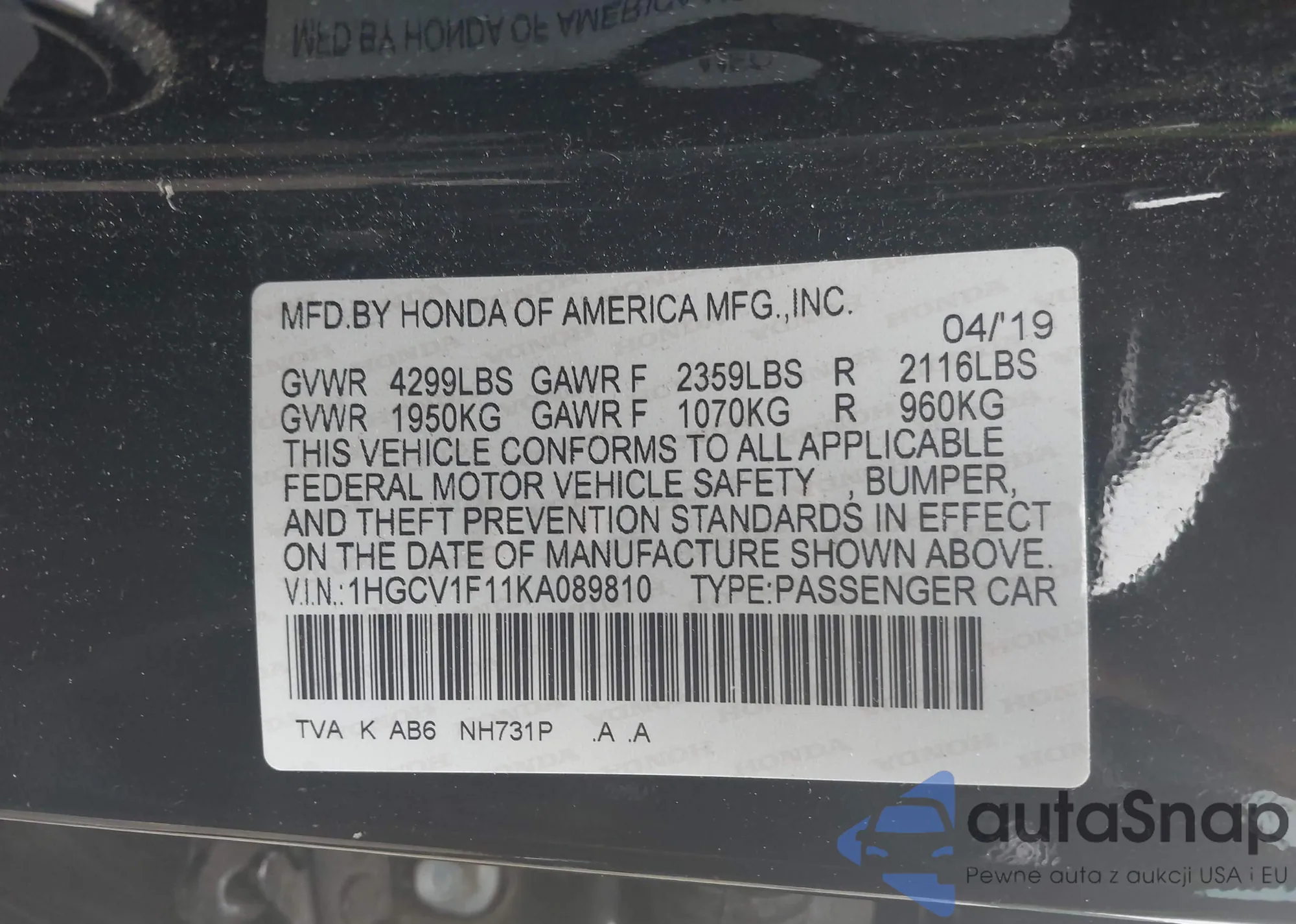 LOT: 42582389 VIN: 1HGCV1F11KA089810
