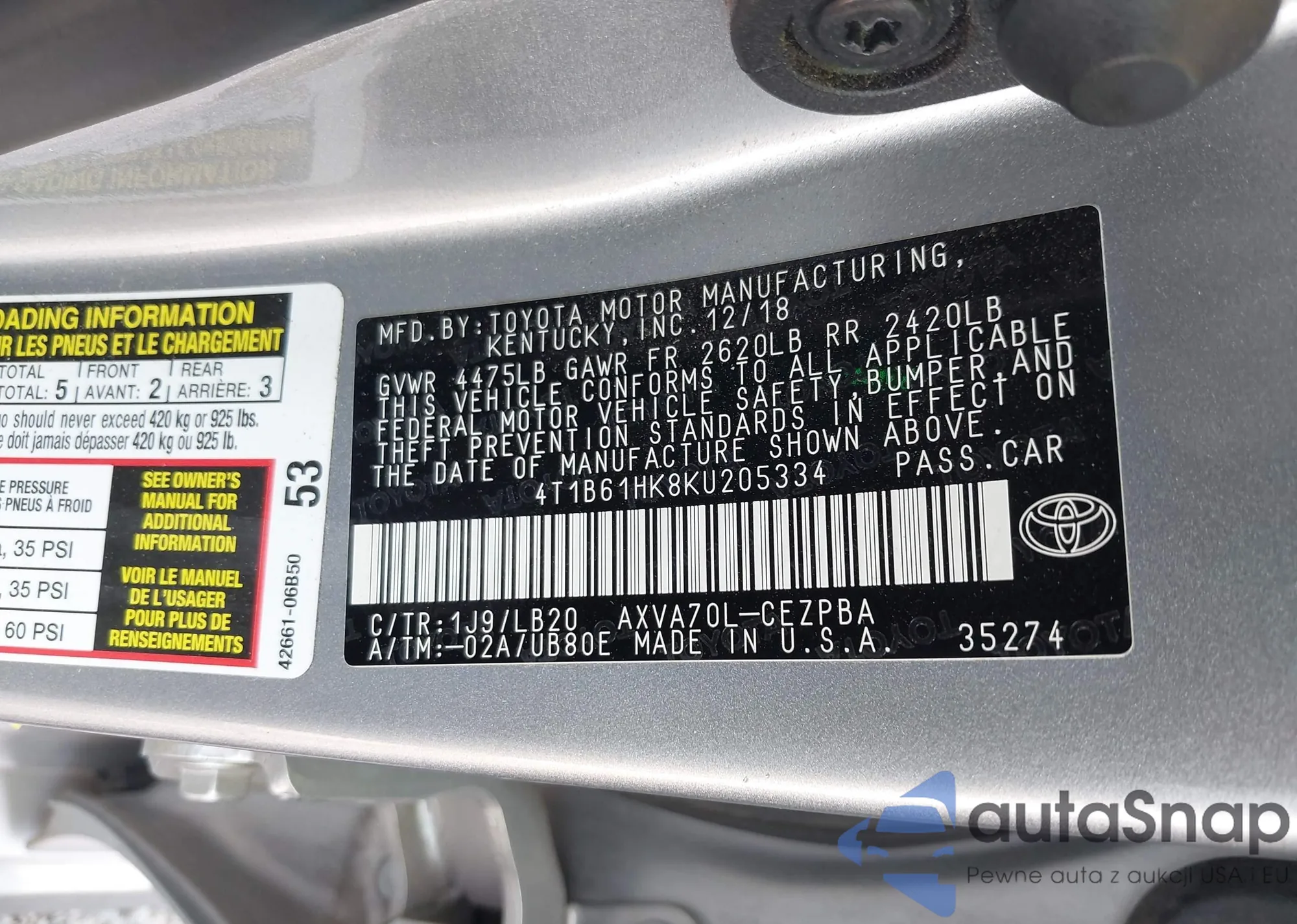 • VIN 4T1B61HK8KU205334