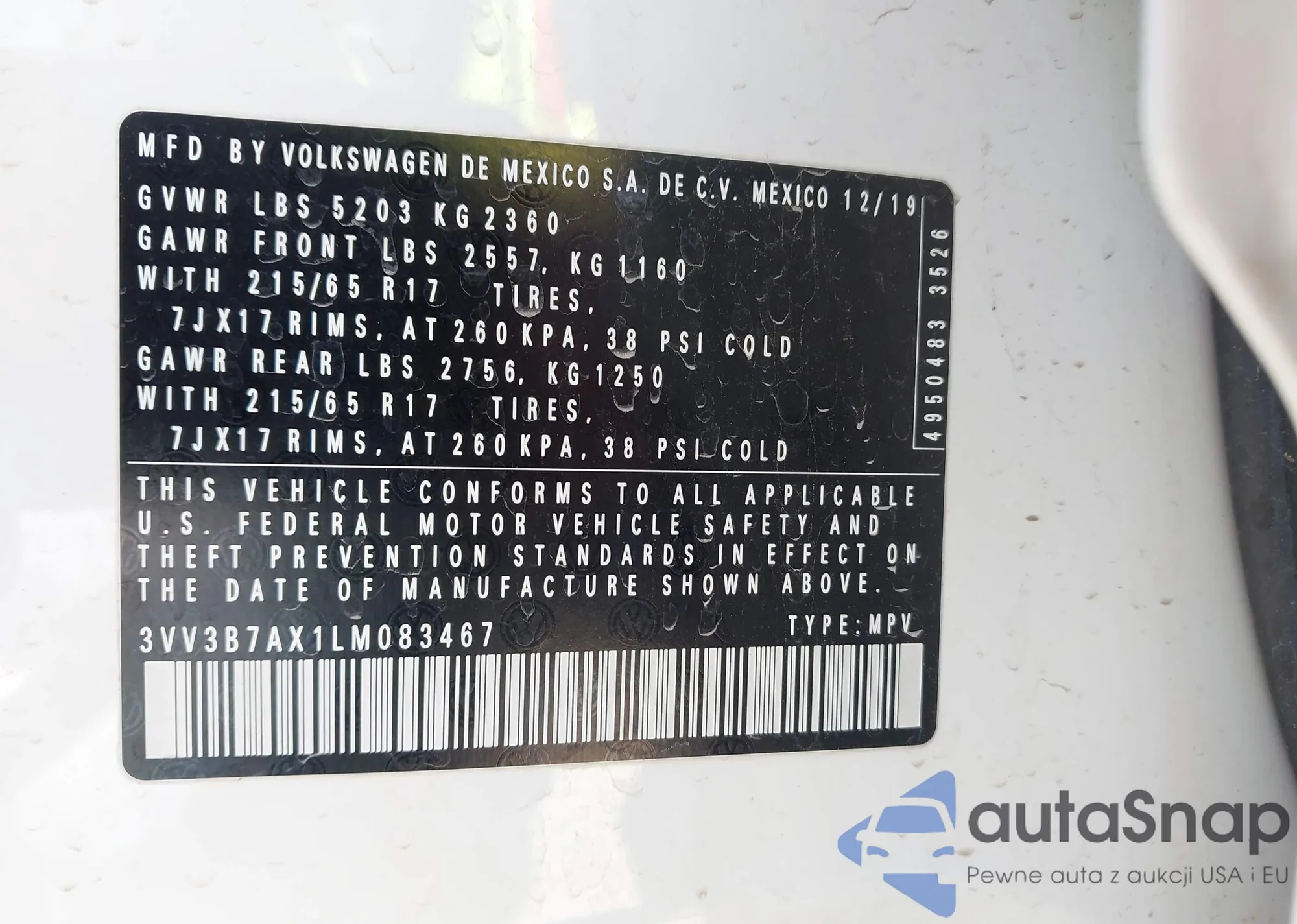 • VIN 3VV1B7AX3LM140050